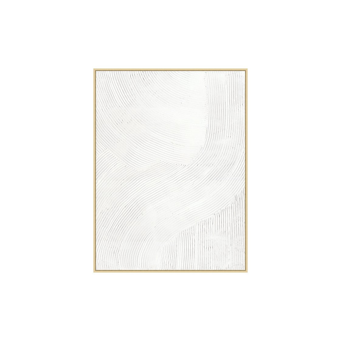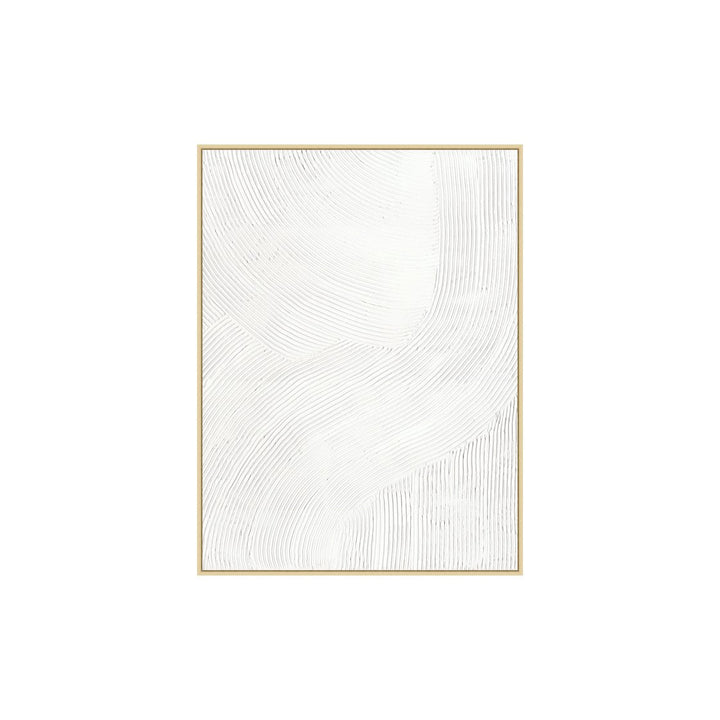Beautiful and neutral, this large hand-painted art piece is perfect in any room. Textured gallery wrapped canvas with light wood frame.