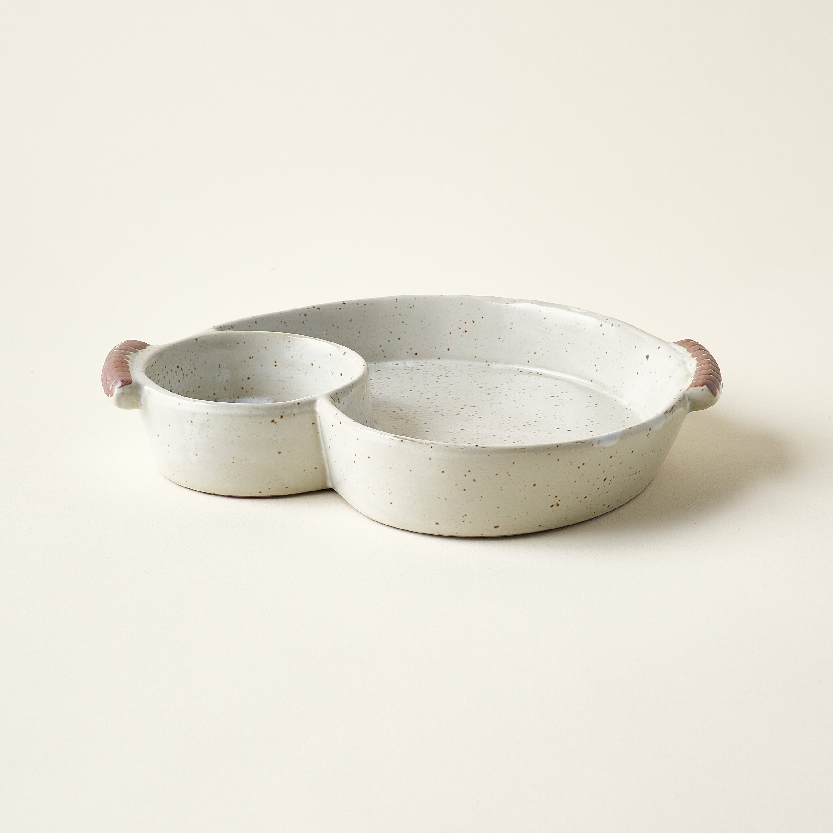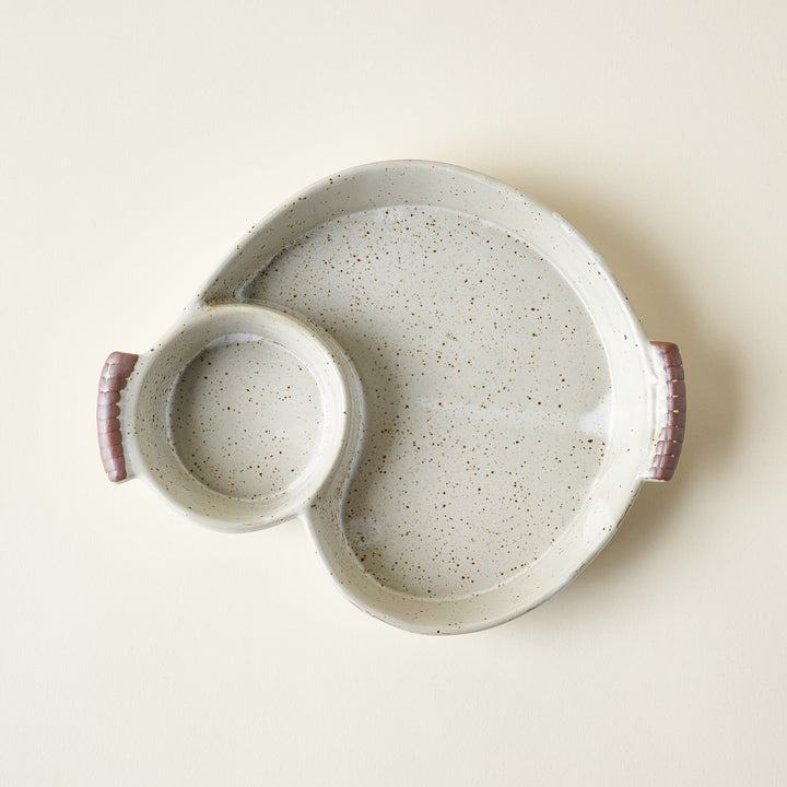 Our Two Section Stoneware Dish is crafted with high-quality, glazed stoneware and features two sections and handy handles. The reactive glaze finish gives each piece its own individual look with a beautiful creamy color. Perfect for serving small plates, snacks, and dips.