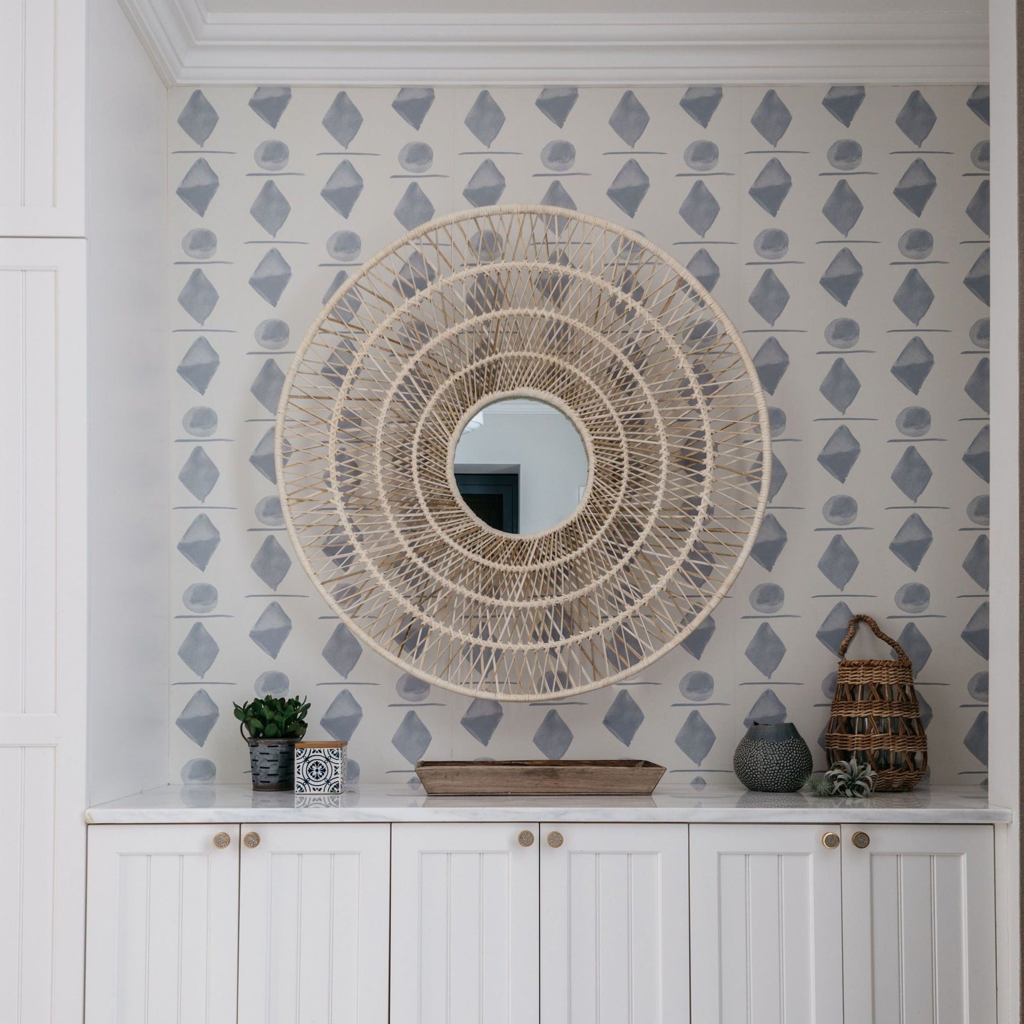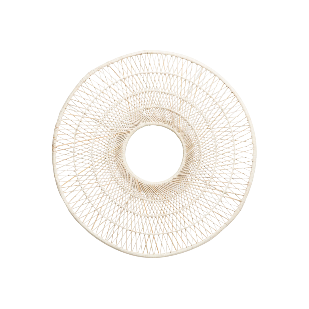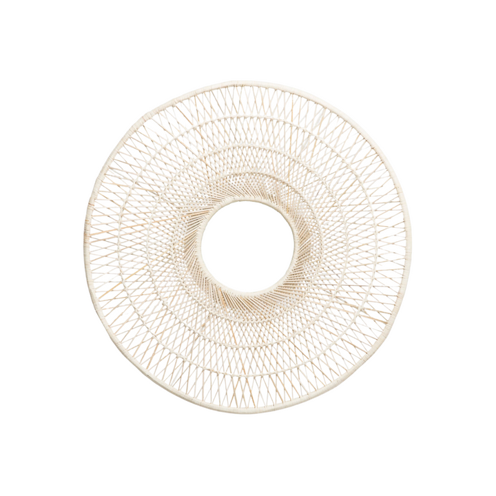 This eye catching mirror puts the detailed woven look of a peacock chair into mirror form. With a nod to the geometric intricacies of spirograph patterns, this '70s-inspired mirror also has substantial depth, with a large border that extends away from the wall, casting a graphic shadow behind it.