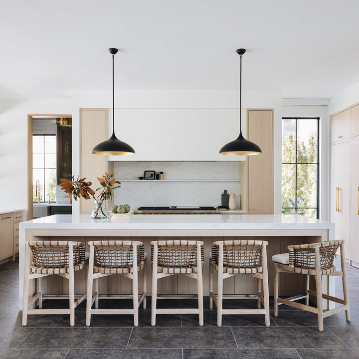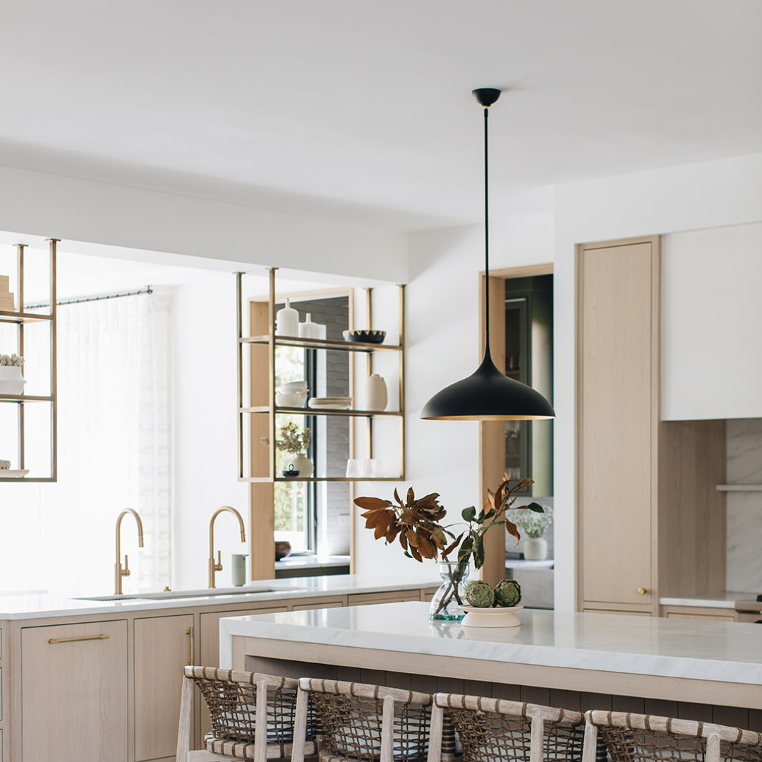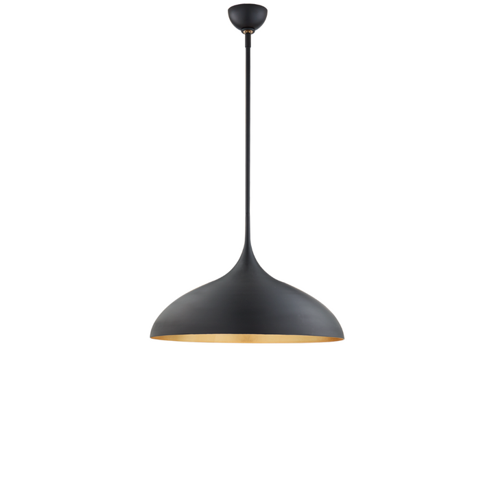 Clean-lined pendant light with a gold color on the interior of the shade. Perfect in the kitchen over an island.