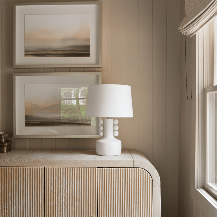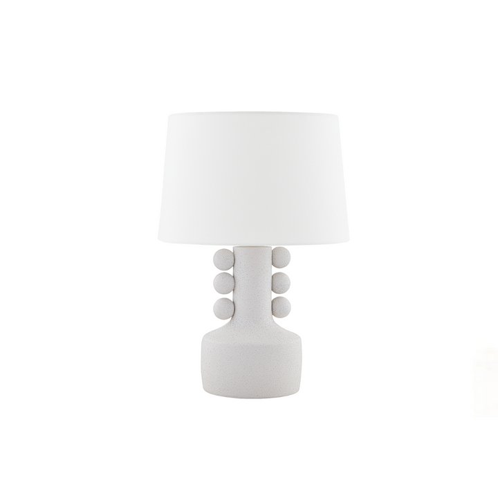 Introduce a touch of whimsy to any space with the Amalia Table Lamp. The unique surrealist form and speckled crackle glaze add a fun and fresh element, while the bauble-like spheres and white linen shade provide a subtle yet striking touch. Elevate any room with this modern and monochromatic lamp.
