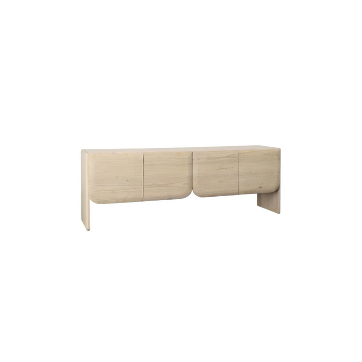 The Amie Sideboard is a true statement piece crafted by talented artisans from Indonesia. Its clever design incorporates meticulous craftsmanship, while bringing warmth to any space. Soft, rounded edges and a nude finish highlight the exotic wood's cascading grain patterns. With four doors and ample storage, it is perfect as a media console or dining buffet.