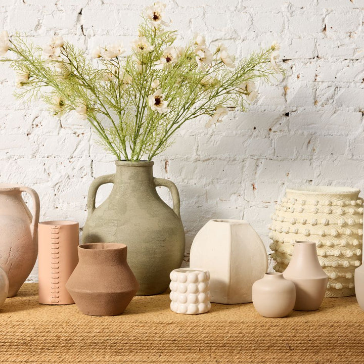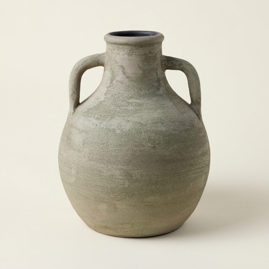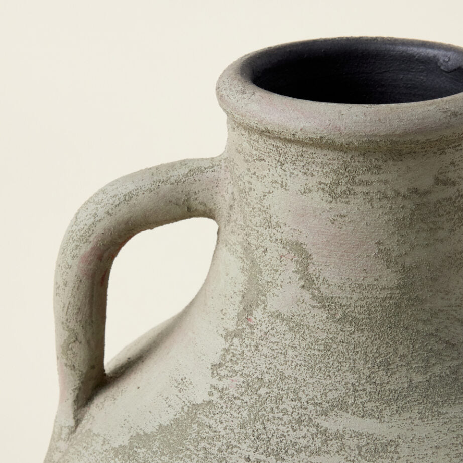 The Anata Vase is a timeless and sculptural piece, handmade by skilled artisans in Portugal. Its unique, two-handled design and classic round silhouette in a soft green shade with a sandy texture make it the perfect addition to any space.