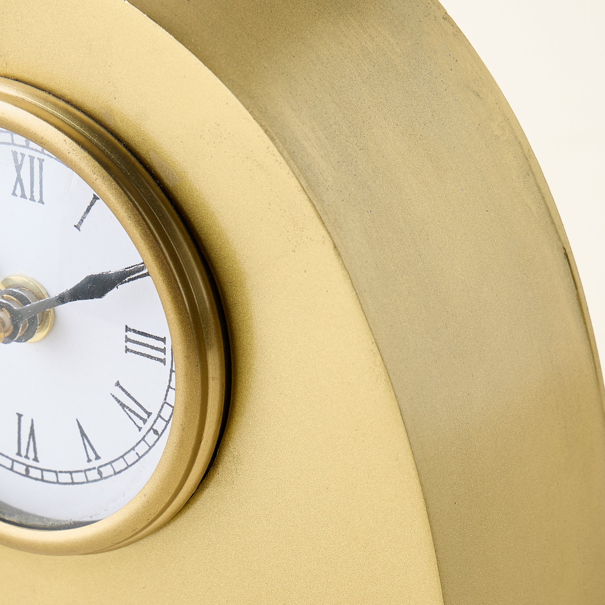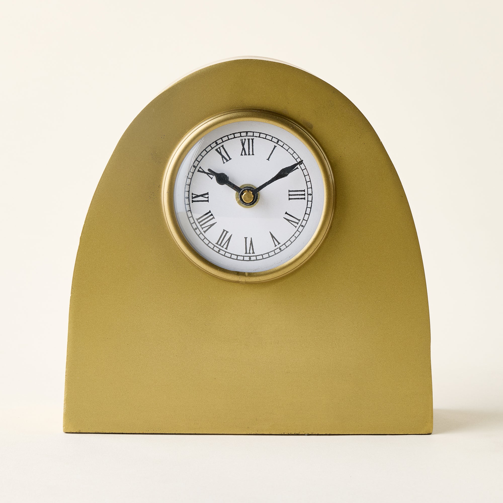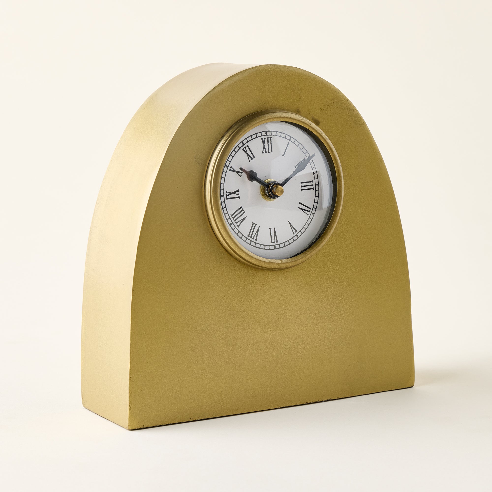 A classic addition to any space, this Arched Mantel Clock features an antique brass finish lending to a vintage-inspired design. Its compact size and metal construction make it durable and functional, while it keeps reliable time with just one AA battery. Perfect for styling on mantels, bookshelves and tabletops!