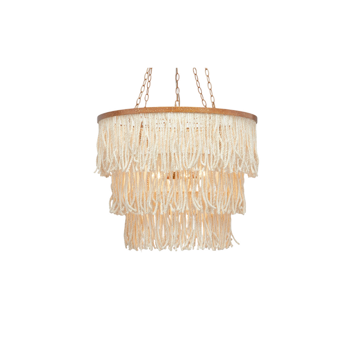 The Arricka Chandelier reimagines abaca with a deconstructed, casual aesthetic. Instead of traditional weaving, short segments of bleached abaca rope organically line its three tiers, creating dynamic movement and texture. The metal rim provides a sleek contrast, which balances the natural fibers with a polished finish, bringing a lively yet refined presence to any room