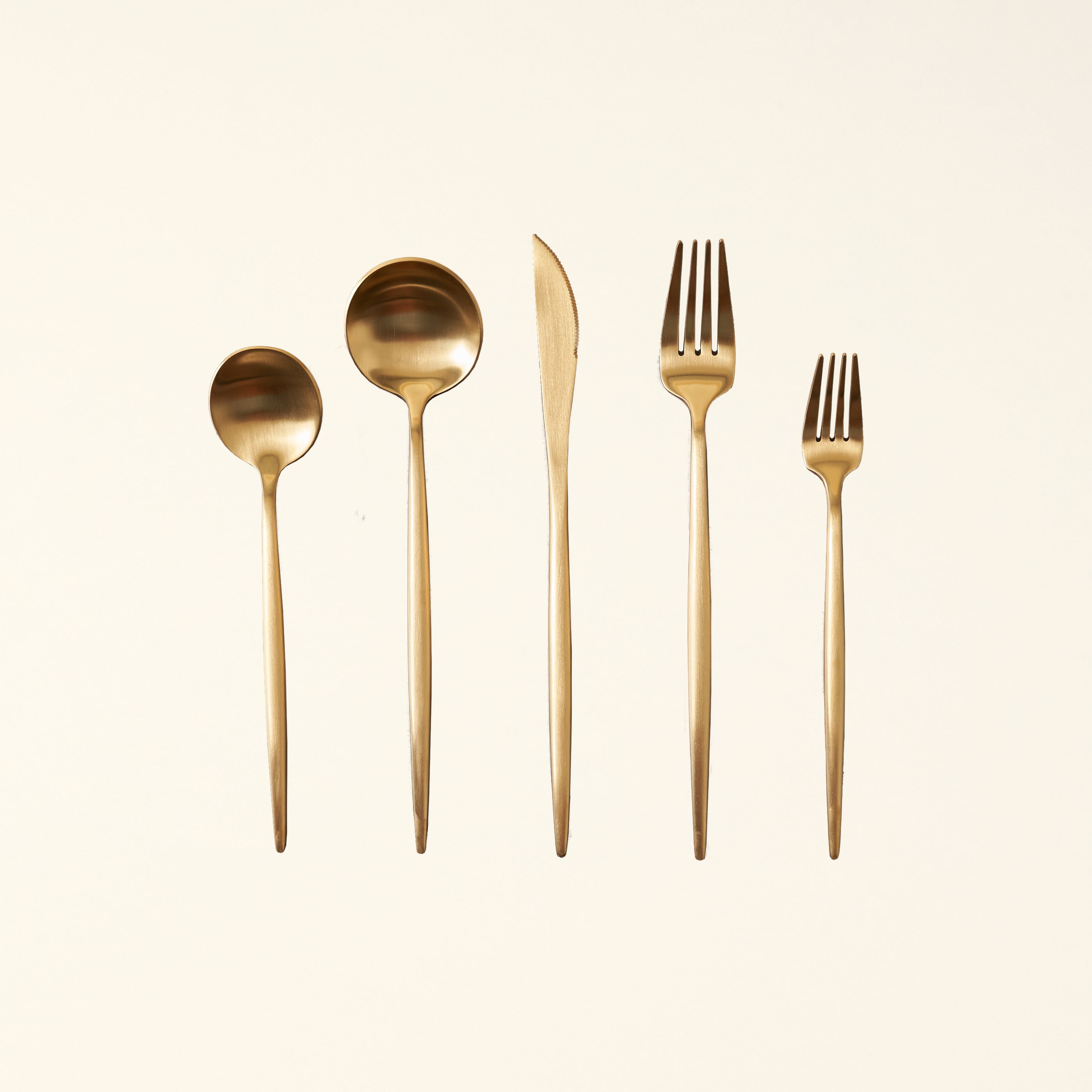 Dress your dining table with beautiful flatware that is far from ordinary. Made from high-quality 18/10 stainless steel with a matte gold finish and modern shapes. Features an ergonomic handle that combines high-end heavyweight flatware with comfort.