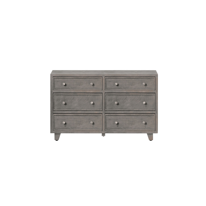 The Aurora Dresser expertly blends traditional craftsmanship with mid-century modern aesthetics. Crafted entirely from rustic mango wood with a light gray finish, this low-profile dresser features six spacious drawers for ample storage. Its distinctive decorative slats and sturdy tapered legs provide both visual interest and lasting stability, making it a refined addition to any interior.