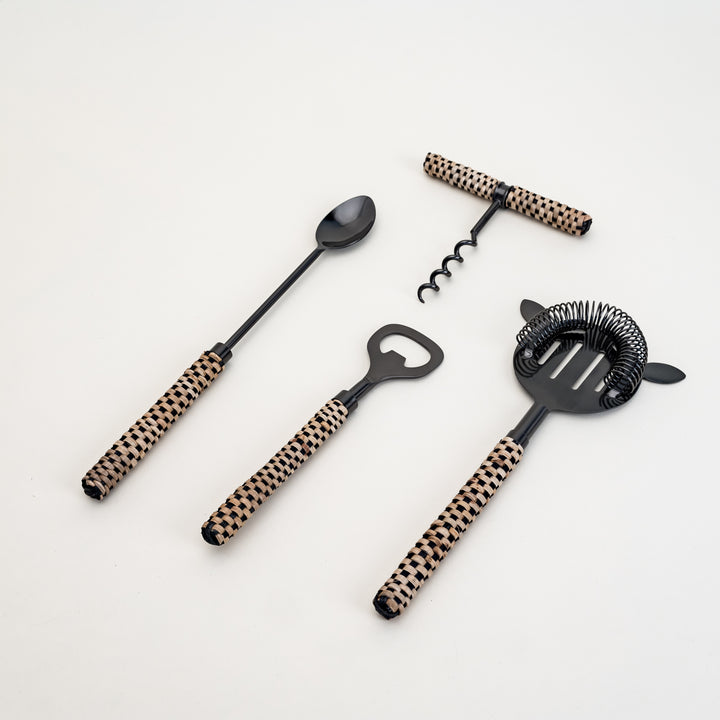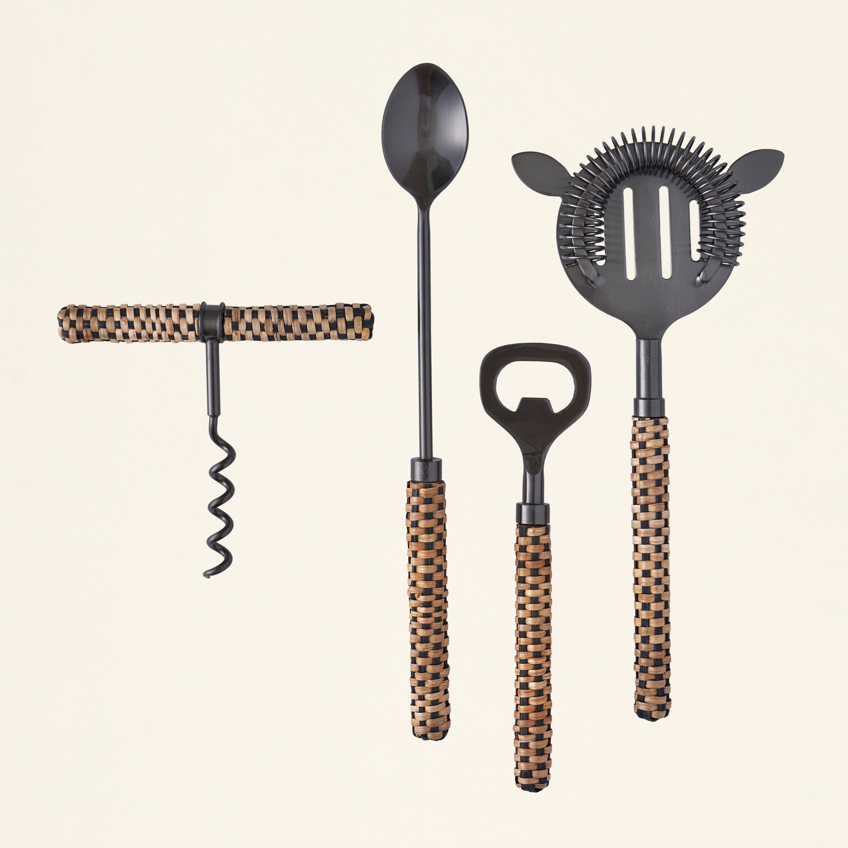 Set of 4 Black & Natural Stainless Steel Bar Tools with Rattan Wrapped Handles in Printed Drawstring Bag