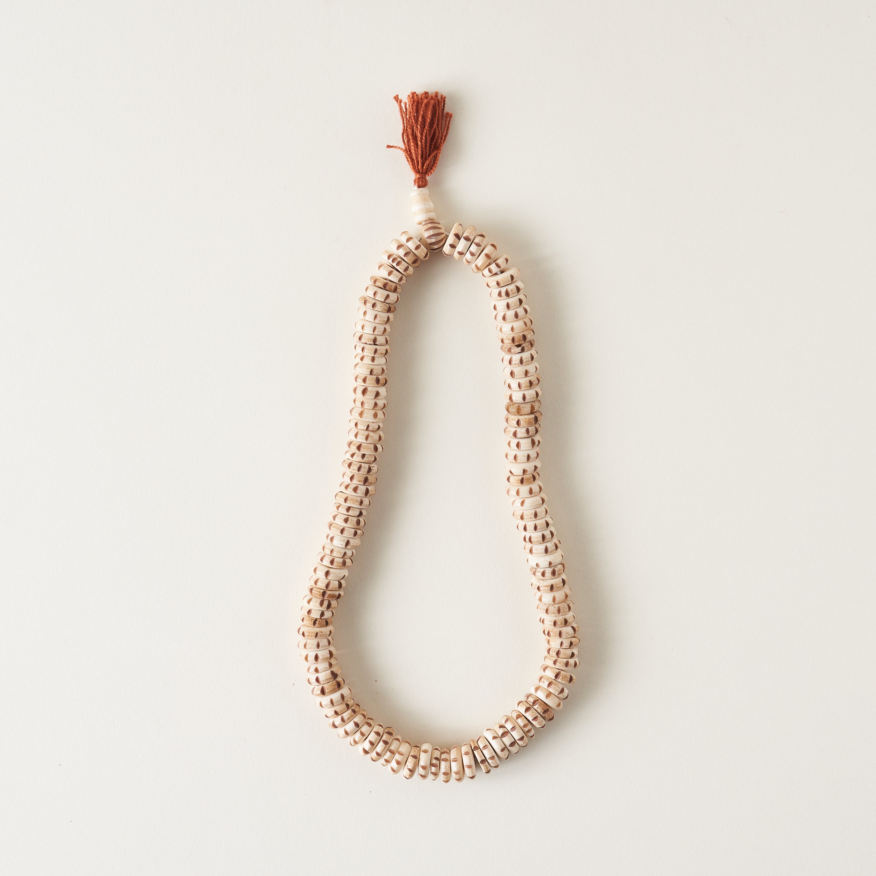 Enhance your home's look with these beautiful Beige Carved Disk Bone Mala Beads. Handcrafted with intricate details, these malas are perfect for styling inside a box or on a tray. Complete with a unique tassel, these beads make a stylish statement!