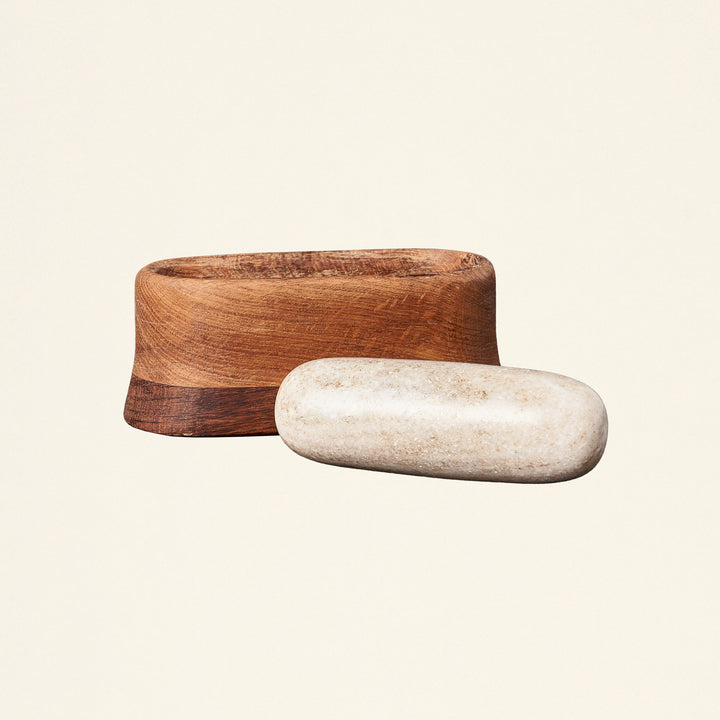 Imported premium French Oak is shaped by hand into this beautiful and functional mortar with a grey marble pestle. The smaller size of the mortar is perfect for grinding spices and herbs, and the pestle fits into the mortar when not in use. The oak is seasoned with a food-safe oil to highlight the wood grain.
