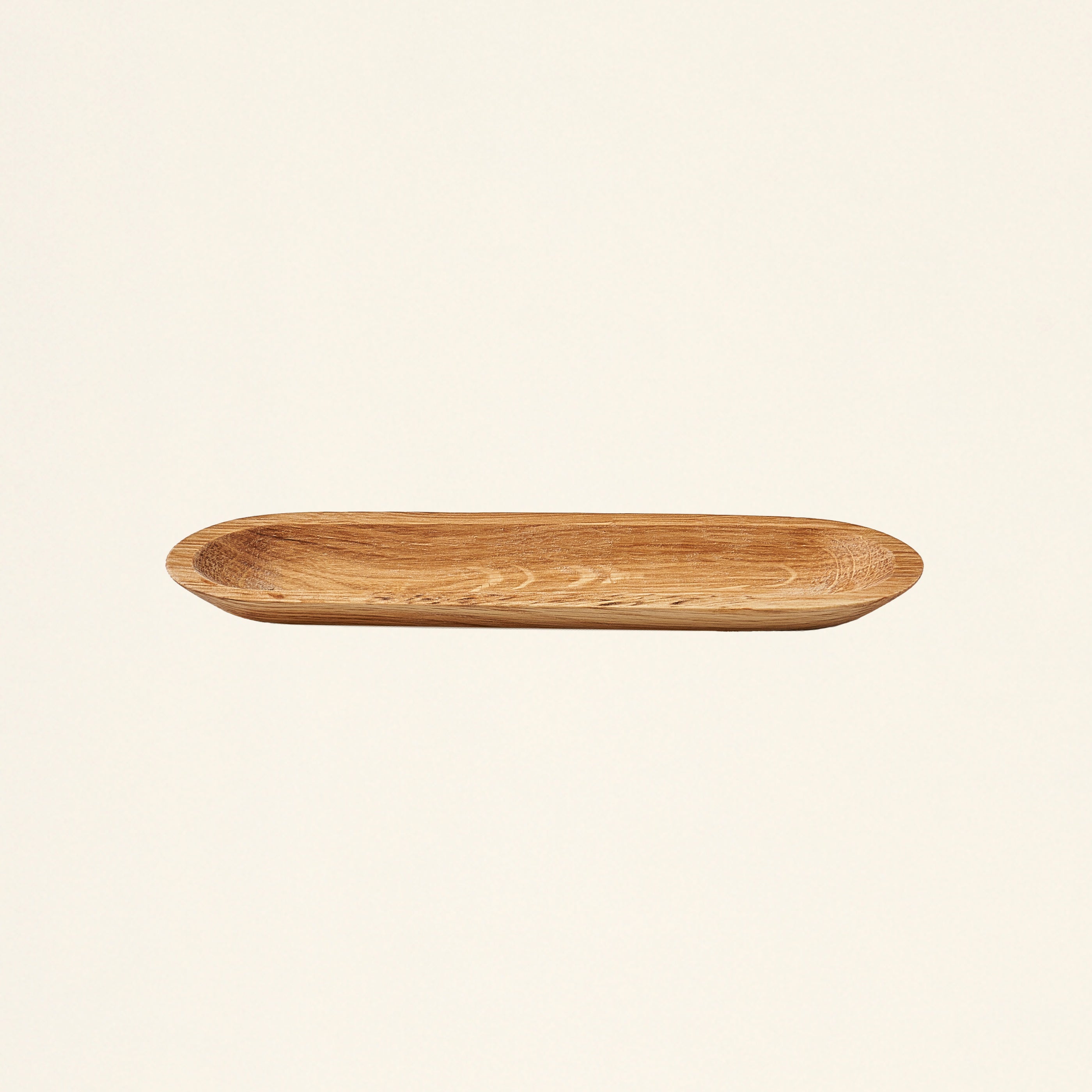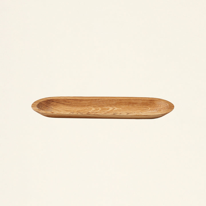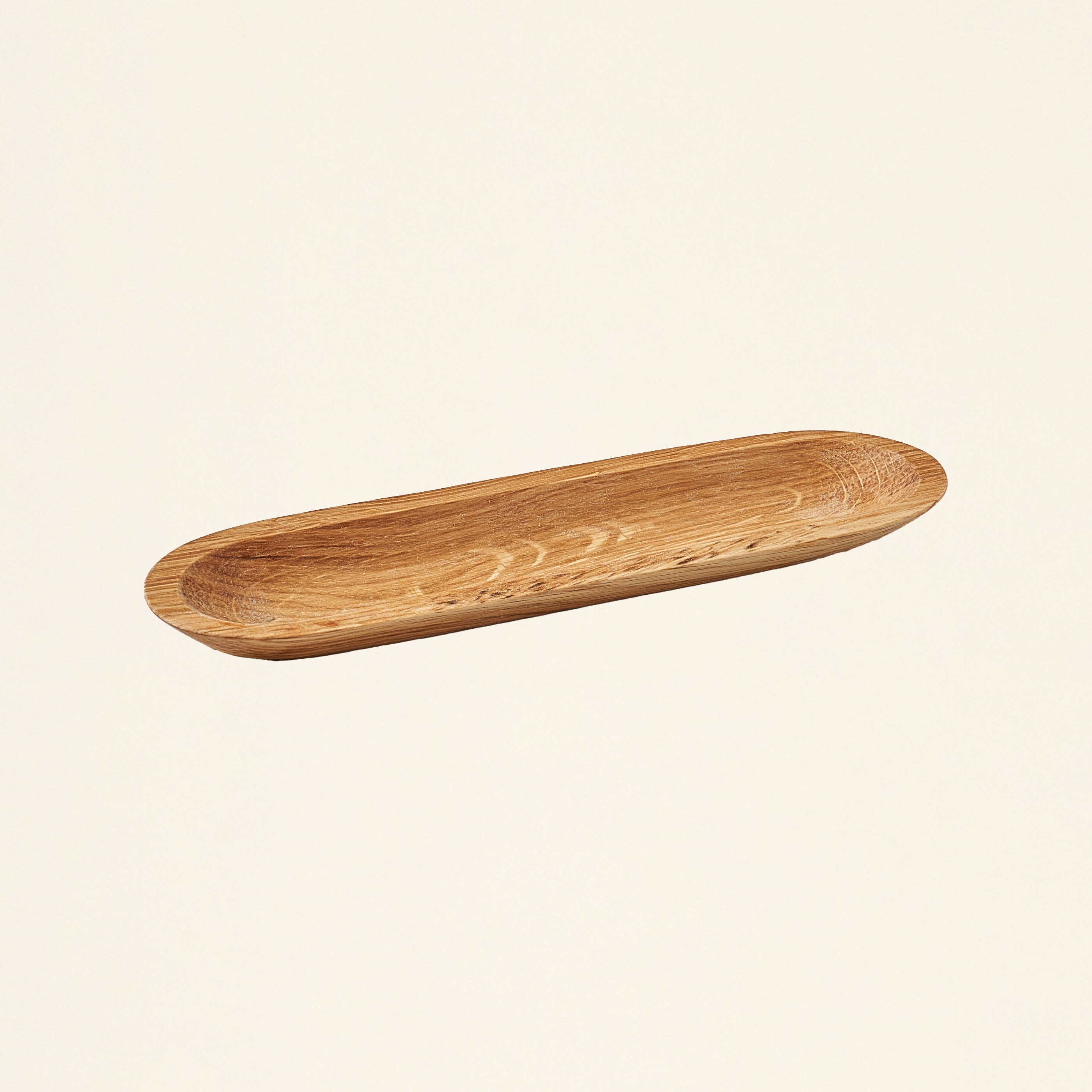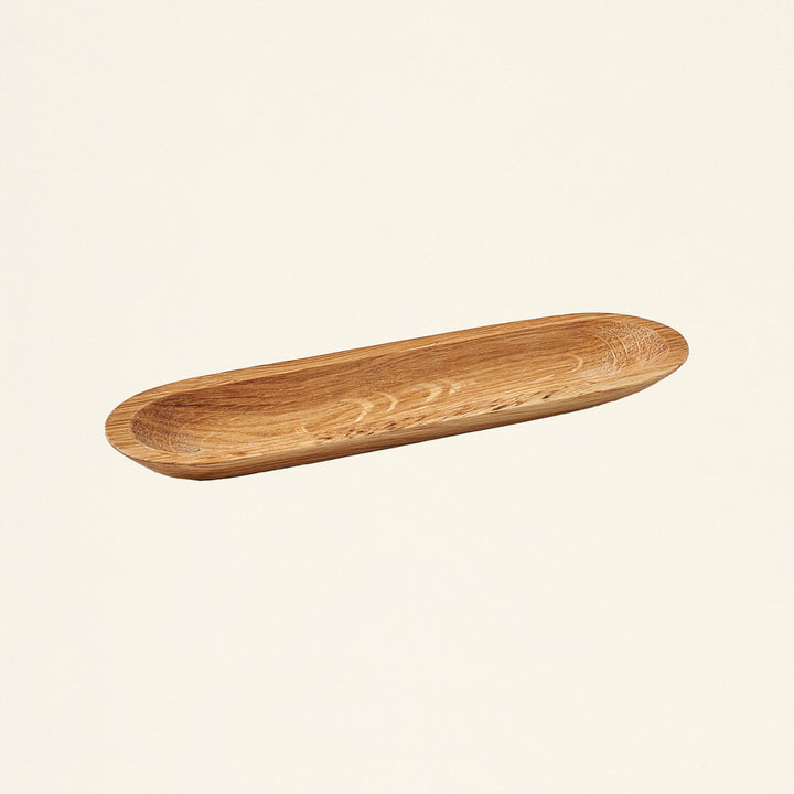 Imported premium French Oak is shaped by hand into this beautiful small oval trough. The oak is seasoned with a food-safe oil to highlight the wood grain. Perfect for serving olives and small appetizers.
