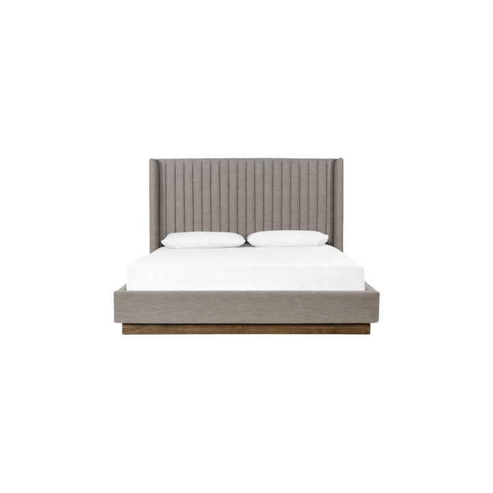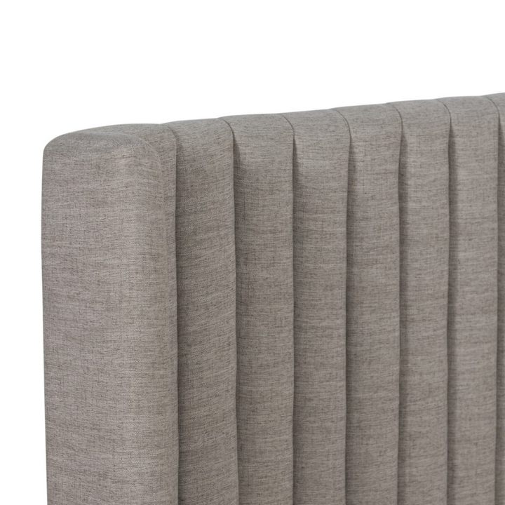 The Bentley Bed showcases a tall, vertical-channeled headboard upholstered in grey high-performance fabric, offering a sophisticated yet practical approach to contemporary bedroom design. Supported by a sturdy parawood plinth base, this bed combines style with durability. The specially engineered performance fabric resists spills, stains, and heavy use, ensuring enduring comfort and long-lasting wear for a refined and resilient sleeping space.