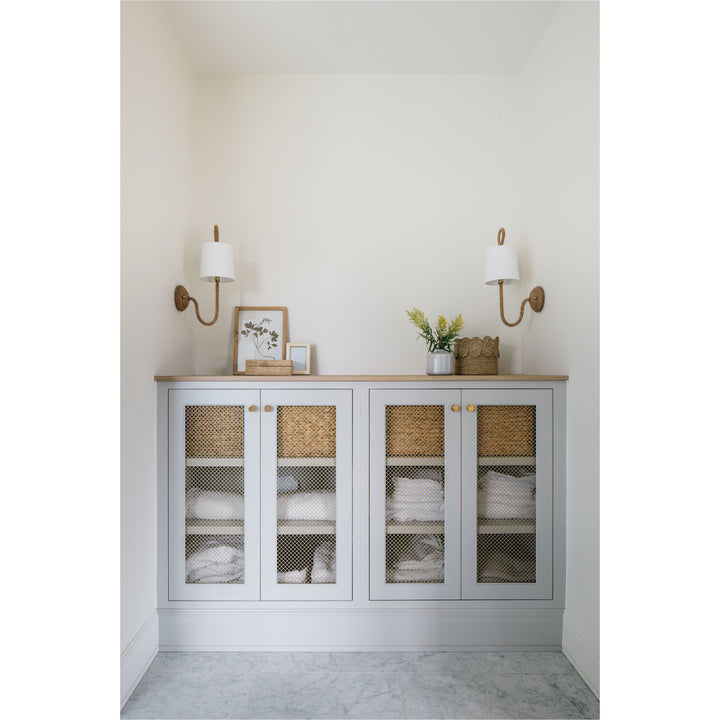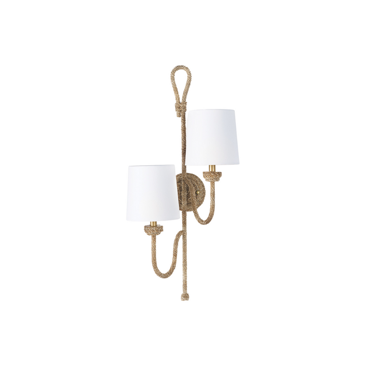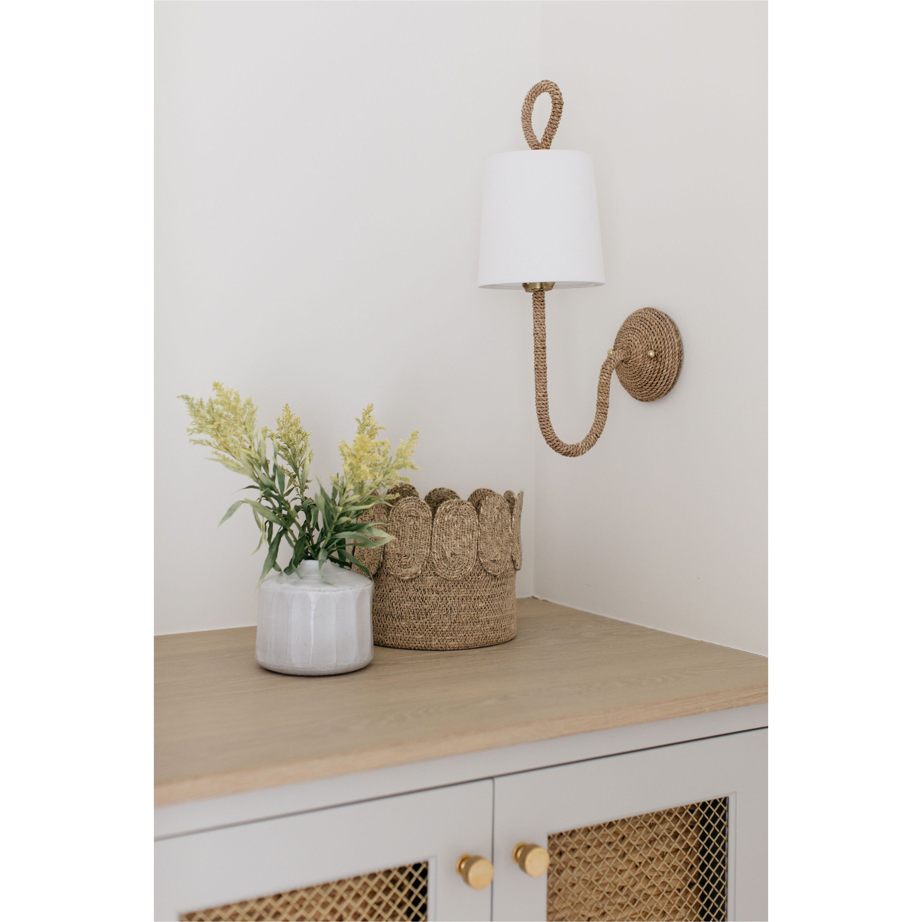 The Bimini sconce features a natural woven seagrass design for a coastal, "washed ashore" aesthetic. With looped detailing and a natural linen shade, this sconce adds a nautical touch to any hallway.