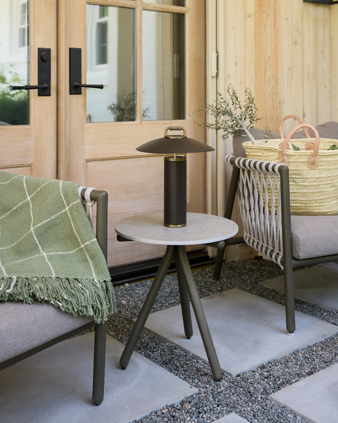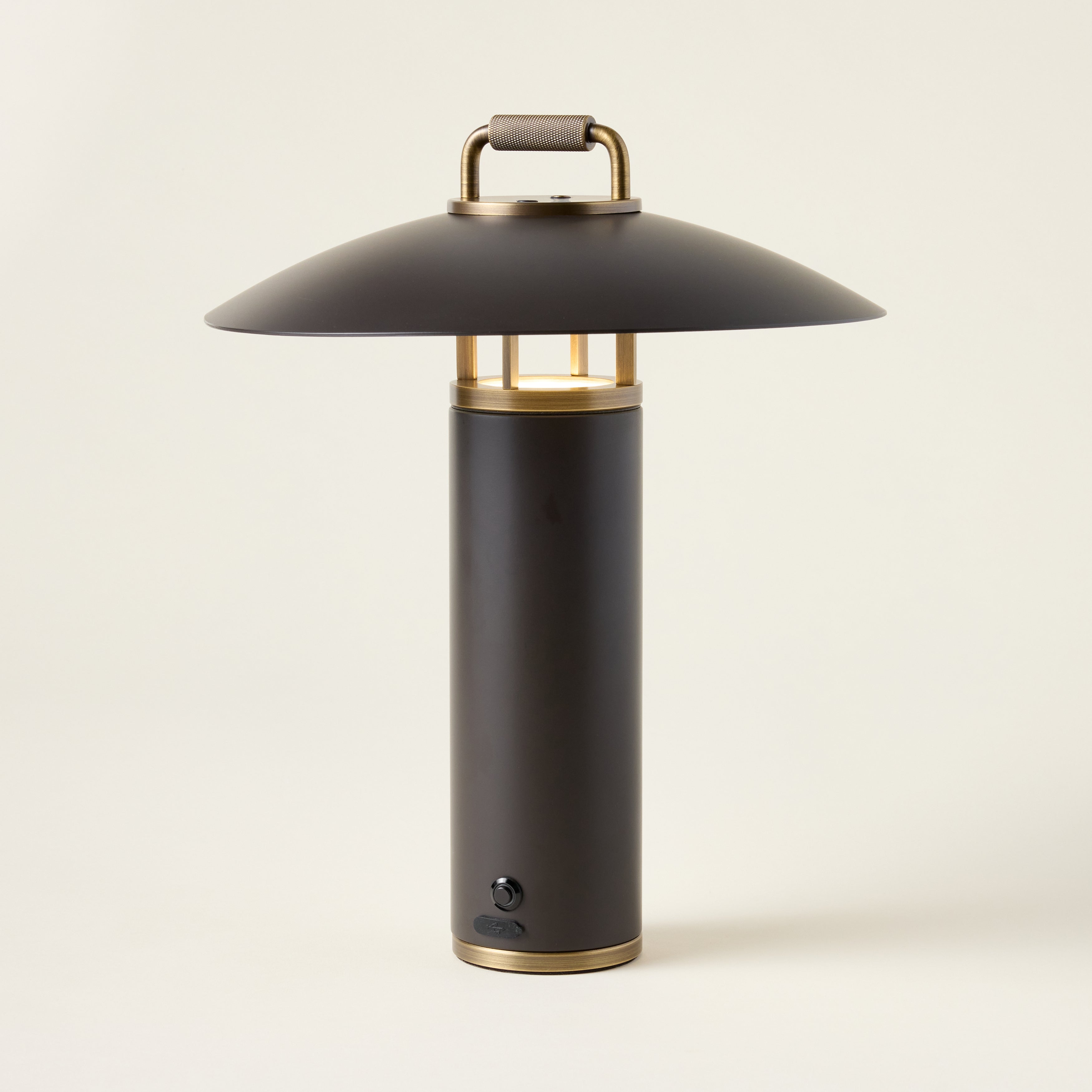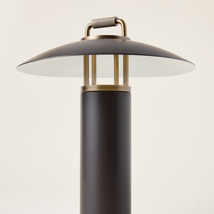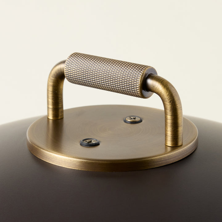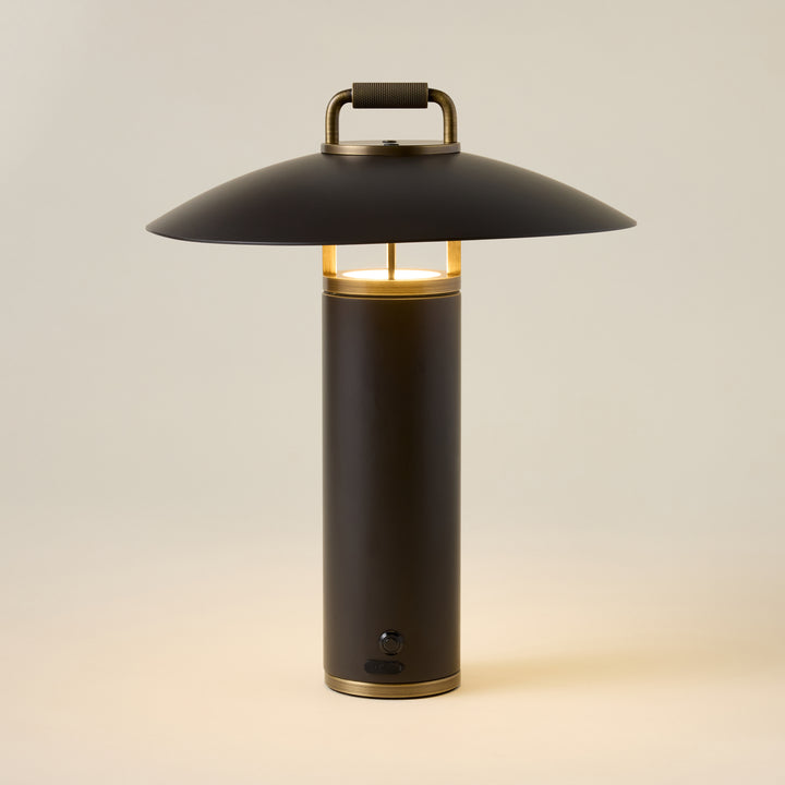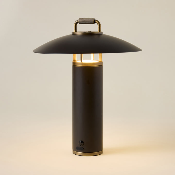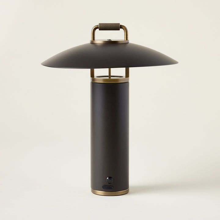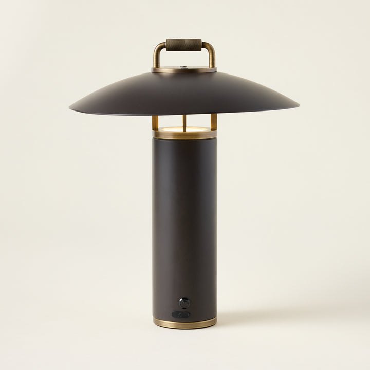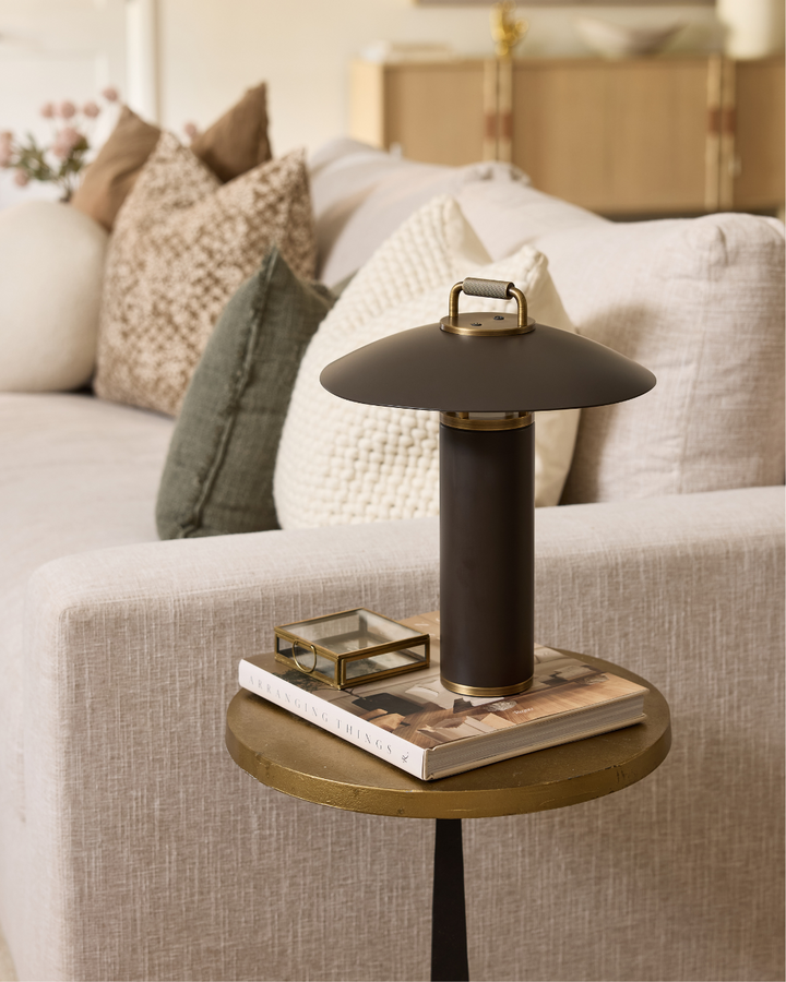 A perfect blend of sleek architectural design and function, the Birk Exterior Rechargeable Table Lamp is a refined lighting solution for both indoor and outdoor use. Its LED light gently reflects downward from the subtle RLM shade, creating a soft, ambient glow. Finished in Bronze with Patina Brass accents, the lamp features an integrated handle for easy portability, making it ideal for illuminating your dinner table or patio seating area.