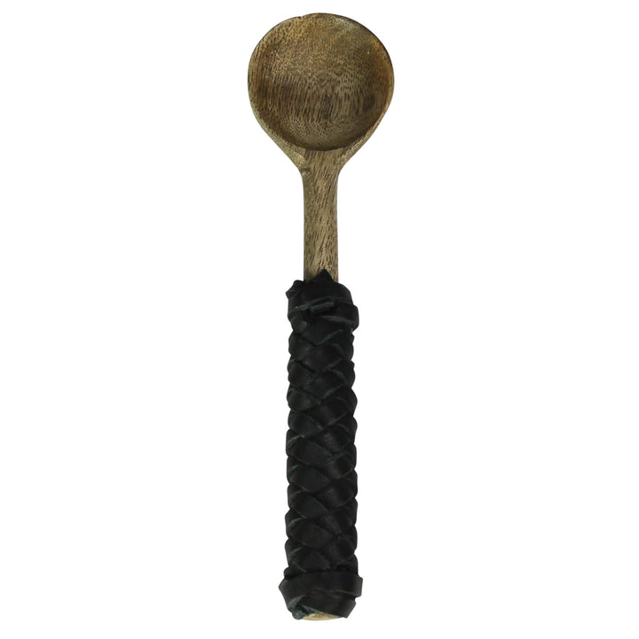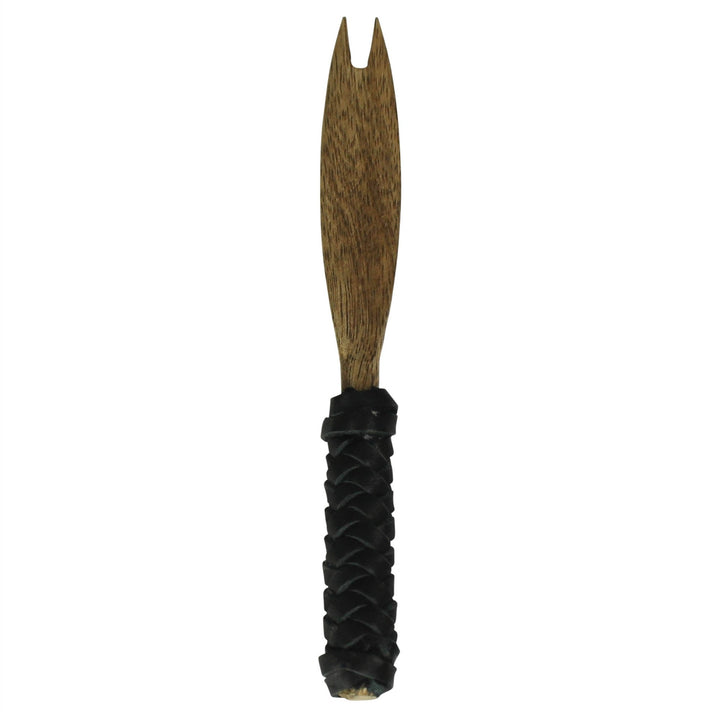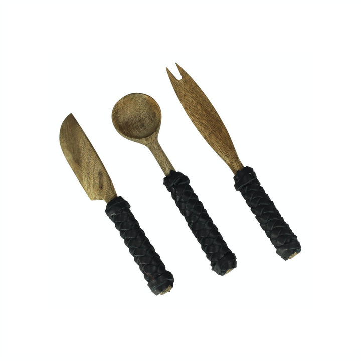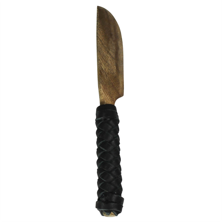 Bold and moody kitchen accessory! These functionally minimal serving pieces are made of richly grained mango wood and genuine leather wrapped handles. Hand wash is recommended.