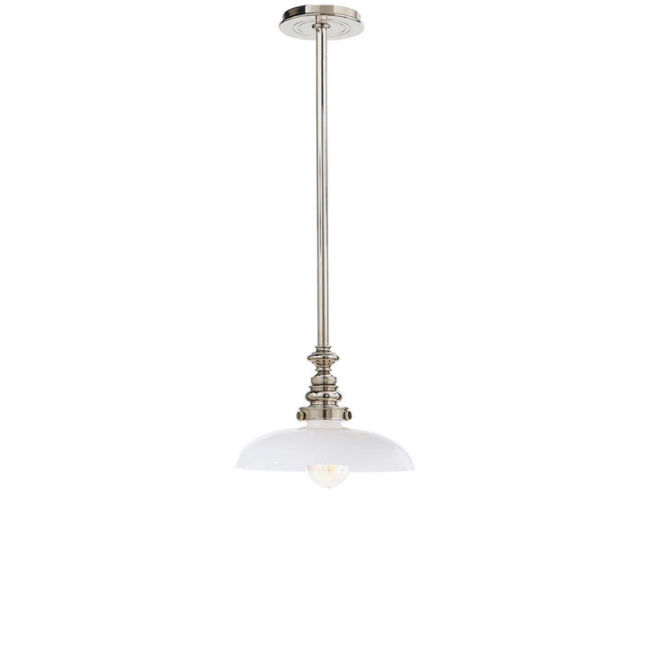 Single pendant in polished nickel with white glass dome. Perfect over a kitchen island.