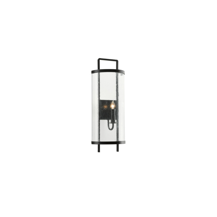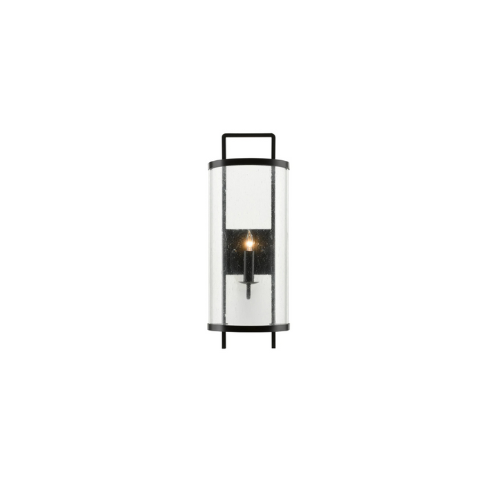 The Breakspear Wall Sconce combines classic Americana style with practical design. Crafted from metal with an antique black finish, it features a seeded glass panel that evokes the look of vintage glass. Certified for damp locations and ADA compliant, this durable fixture offers a straightforward, traditional black sconce option that balances timeless appeal with reliable performance. Ideal for enhancing both indoor and covered outdoor spaces.