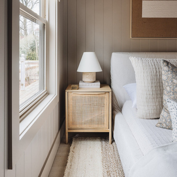 Illuminate your space with the Bronte Table Lamp. Featuring a natural travertine base and tapered paper shade, this lamp adds a touch of sophistication to any room. The patina brass accent highlights its organic texture and directs light downward, creating a warm and inviting atmosphere.