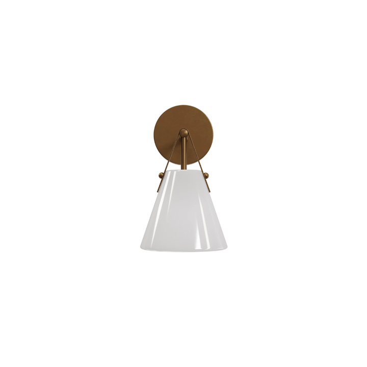 The Bronwen Brass Bath Wall Sconce brings equestrian-inspired elegance to any space with its distinctive design. A flaring white glass shade with a glossy, luminous finish is secured to the round wallplate with a sophisticated strap detail—a refined nod to classic tack hardware. This one-light sconce features an antique brass finish that beautifully contrasts the pale, glowing shade. Versatile enough to complement various design styles, it's damp rated for bathroom use and fully dimmable for customizable ambiance.