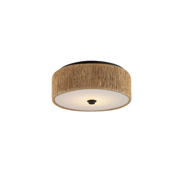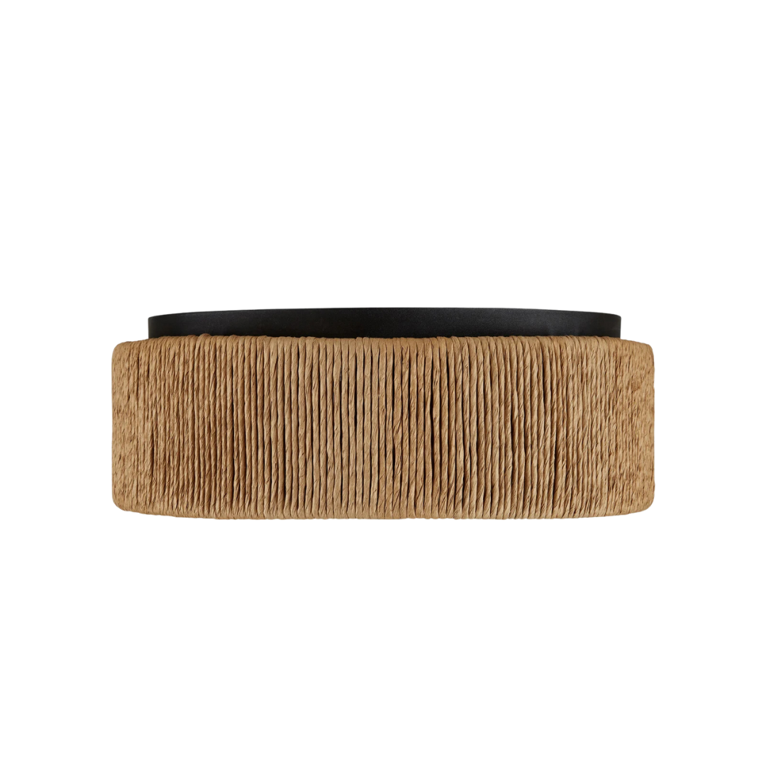 The Brownell Flush Mount has a mix of warmth and brightness. The warmer tones are created by the Kraft paper twine woven around its circumference, the blacksmith finishes on the metal that mounts it to the ceiling, and the finial that fastens the acrylic diffuser to the bottom. The diffuser will create an even glow when light wafts through it. The pale, sleek material is the contrasting element of this design.