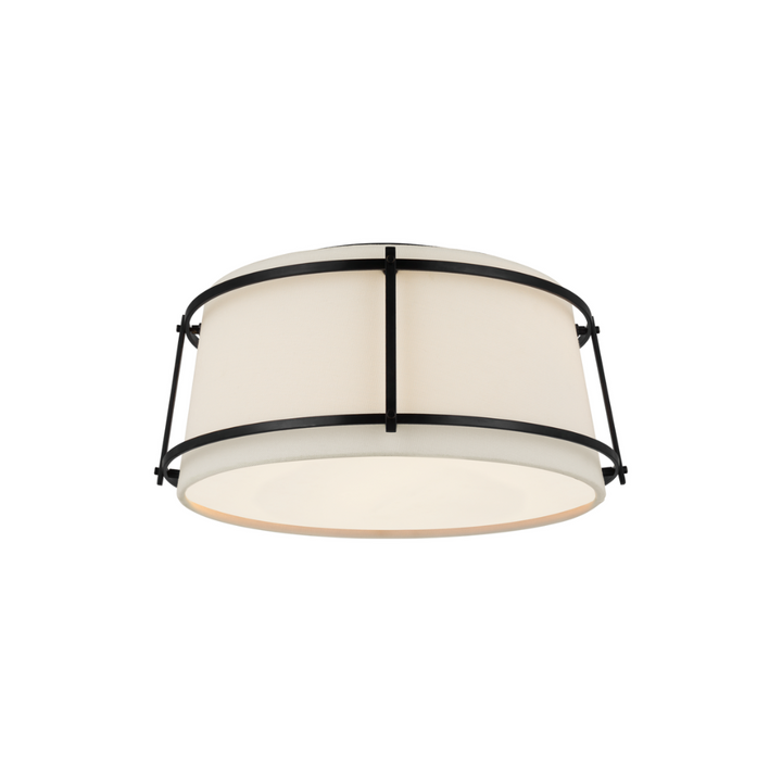 The Callaway Small Flush Mount by Carrier and Company combines form and function with a refined blend of materials and textures. Its tapered linen drum shade is framed by a metal cage, creating a structured yet elegant silhouette. Exposed screws emphasize the design’s industrial character, while the bronze finish complements the natural linen shade. This fixture delivers a soft, inviting glow, perfectly balancing modern sophistication with a subtle vintage charm for any interior space.