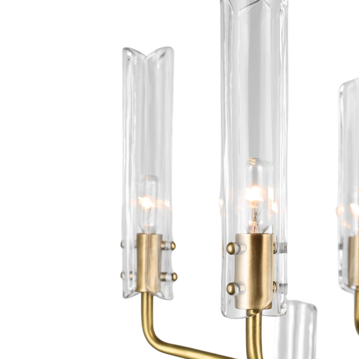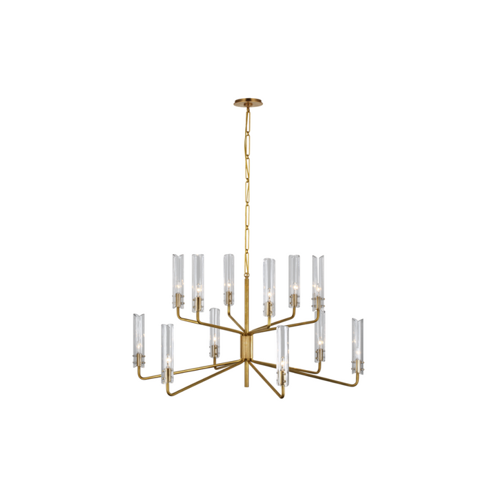 The Casoria Two-Tier Chandelier by AERIN showcases a refined mid-century modern aesthetic with its sculptural, angular design. Featuring elongated glass shades paired with sleek linear frames, this chandelier adds a sophisticated architectural element to any space. The Casoria serves as a striking centerpiece for hallways or great rooms, blending contemporary style with timeless elegance.