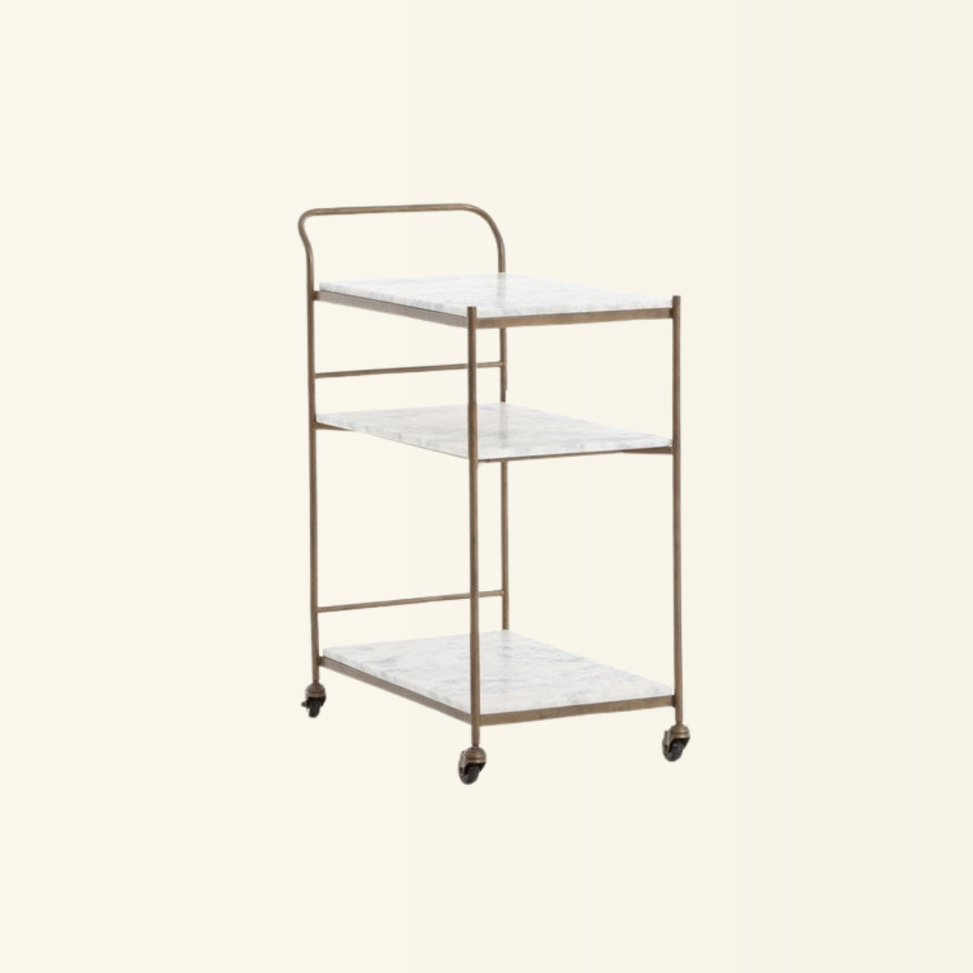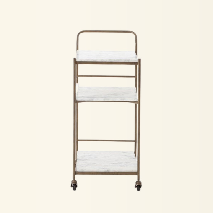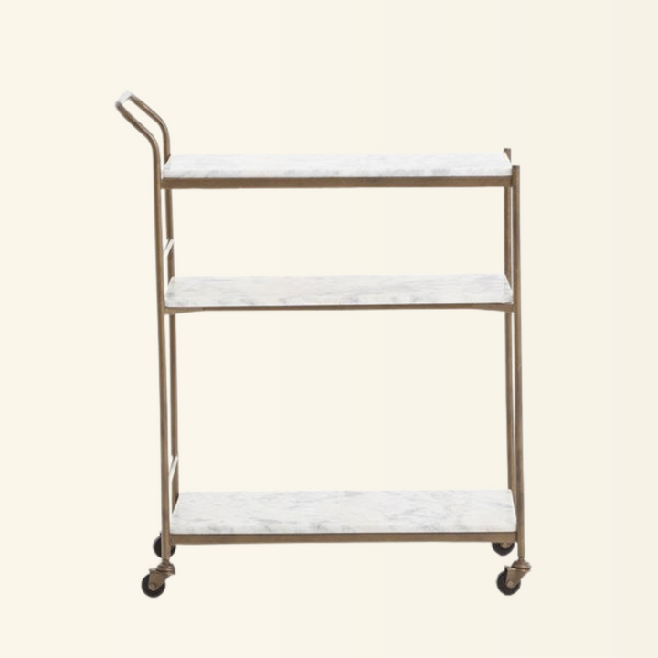 The Cassandra Bar Cart adds a touch of sophistication and elegance to any room! Its antique brass frame and marble tops make it a beautiful yet practical piece of furniture. Perfect for displaying drinks, appetizers, and other items, this bar cart is sure to impress.