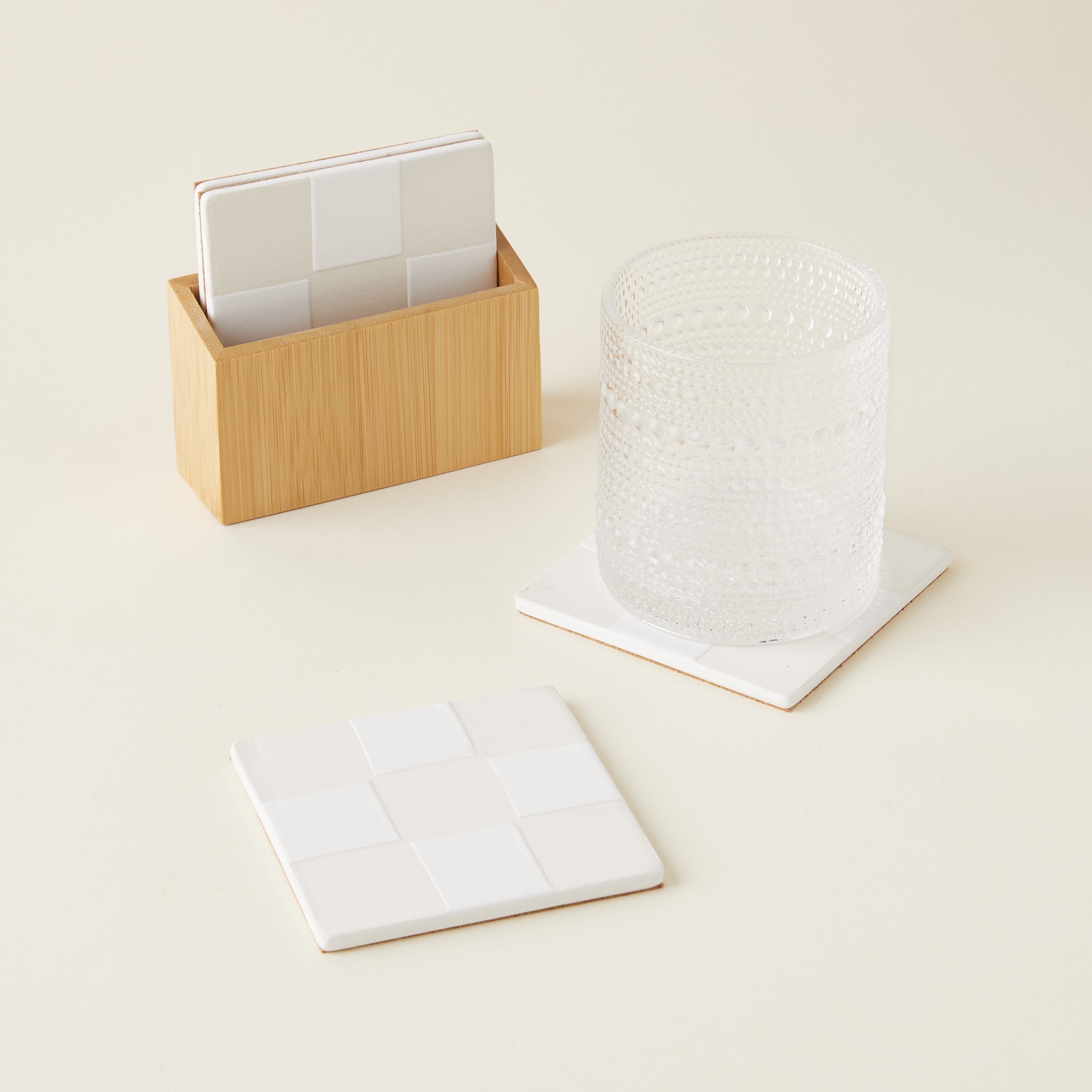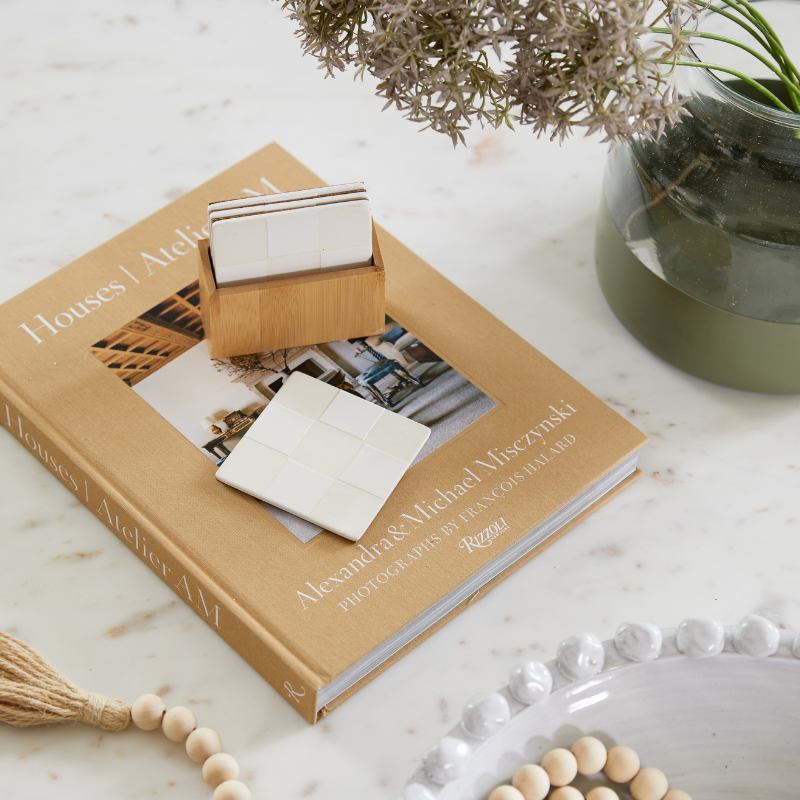 A beautiful way to add timeless charm to any space. This set of four hand-painted stoneware coasters features a neutral checkerboard design that protects your surfaces while adding a touch of sophisticated style. With a functional cork base and a bamboo storage box, these coasters are a beautiful and practical addition to any home.