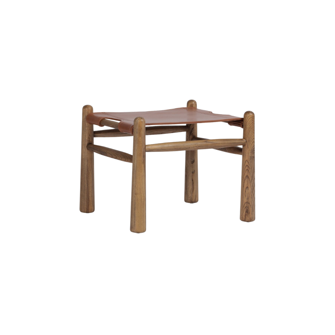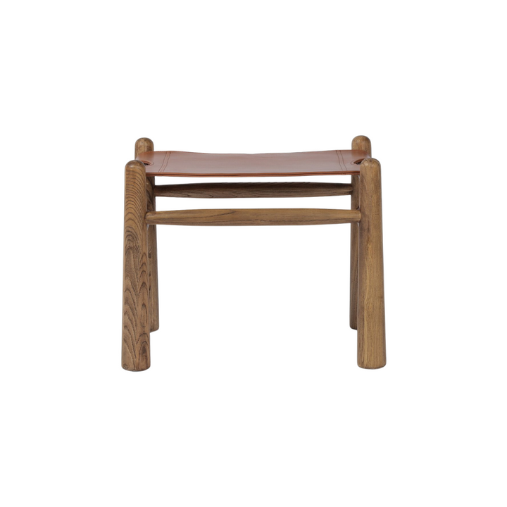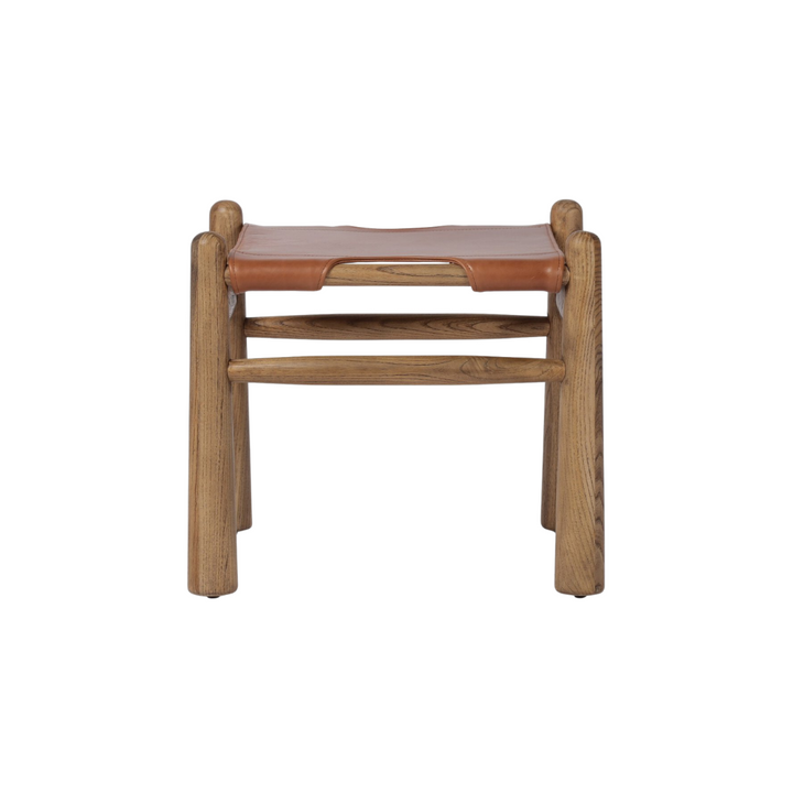Crafted with inspiration from primitive French design, the Cheyenne Accent Stool features toasted parawood tapered legs and a sling-style top-grain leather seat in a rich tobacco finish.