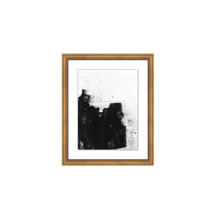 Abstract black and white art. Giclee on matte paper, straight cut and floated on mat and framed in a gold frame.