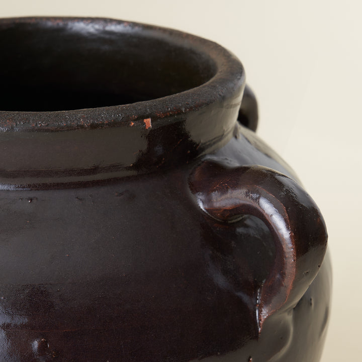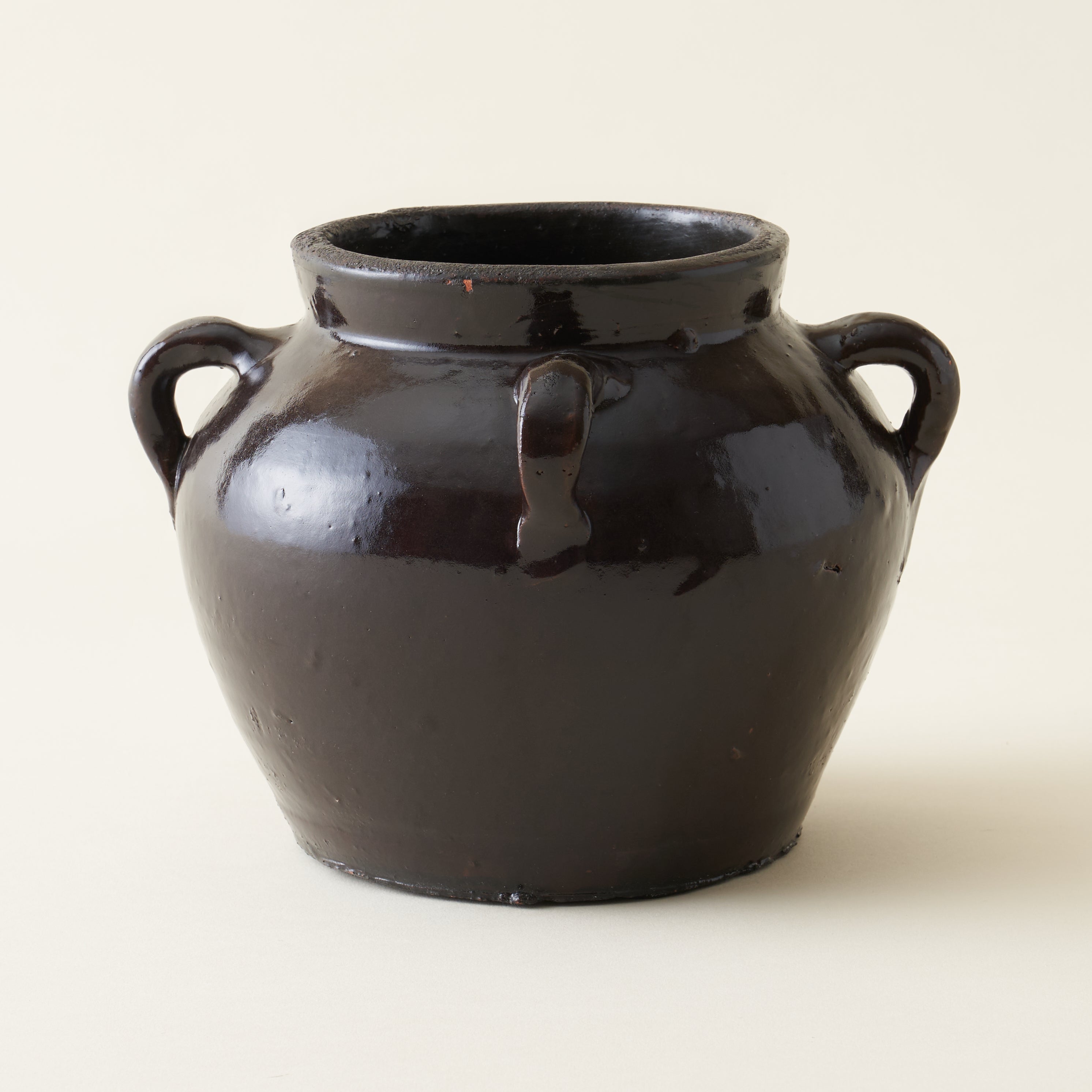 This found Clay Vase is one-of-a-kind featuring a distressed black finish and handles all around. Each piece is unique, bringing an organic element to any design.