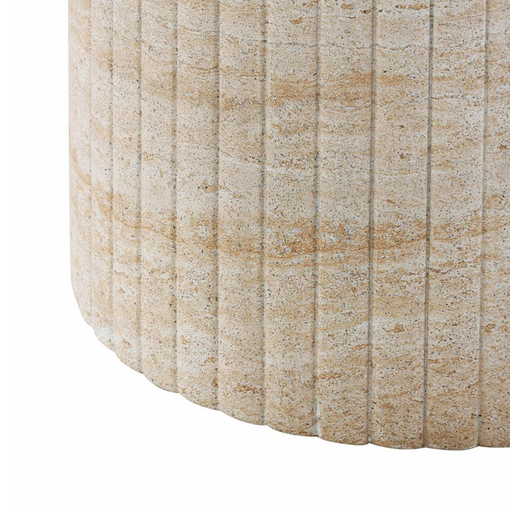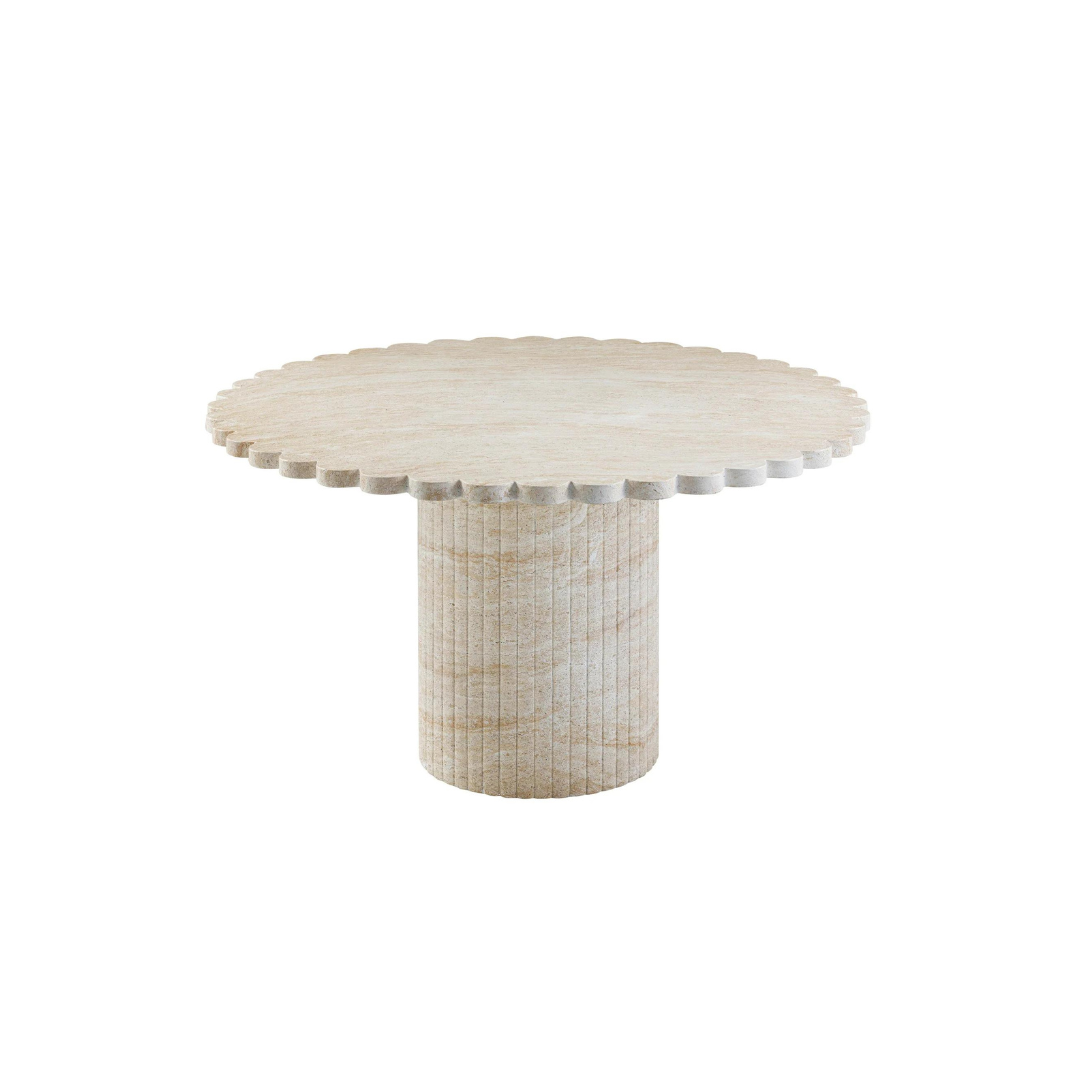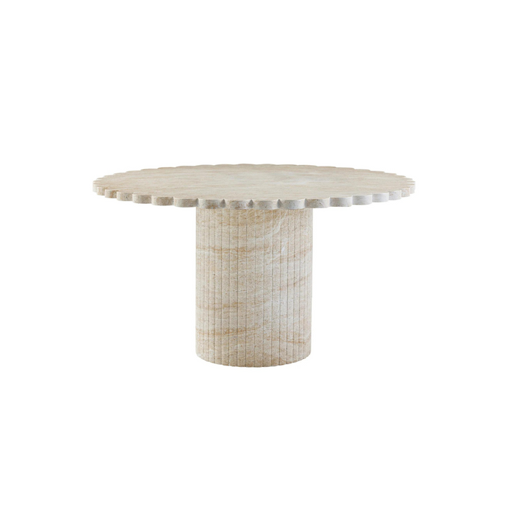 Elevate your dining experience with the Clementine Dining Table. Crafted with durable concrete, this piece is suitable for indoor or outdoor use. Its unique flower petal silhouette and precise vertical channeling exude contemporary chic, while the light washed travertine finish adds an authentic touch. With a generous 54" diameter, this versatile table comfortably seats six, making it perfect for your gatherings. Recommended to cover during inclement weather or when not in use.