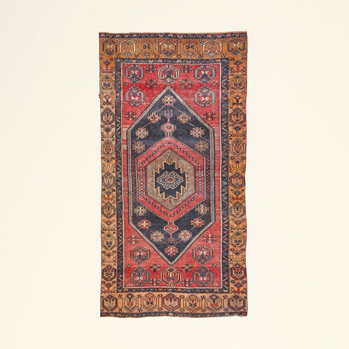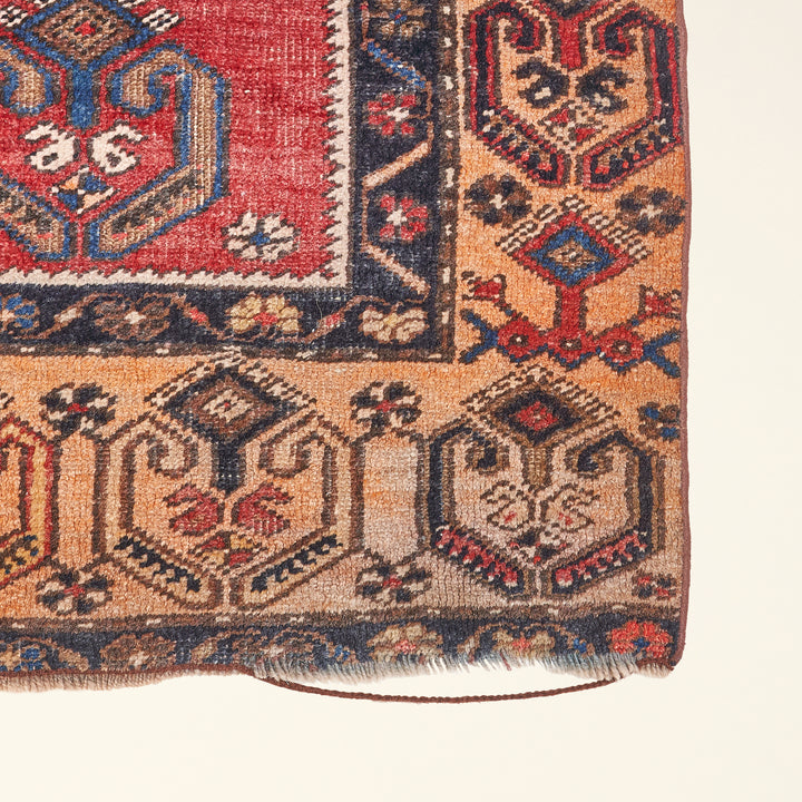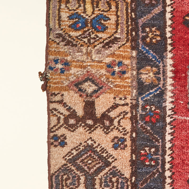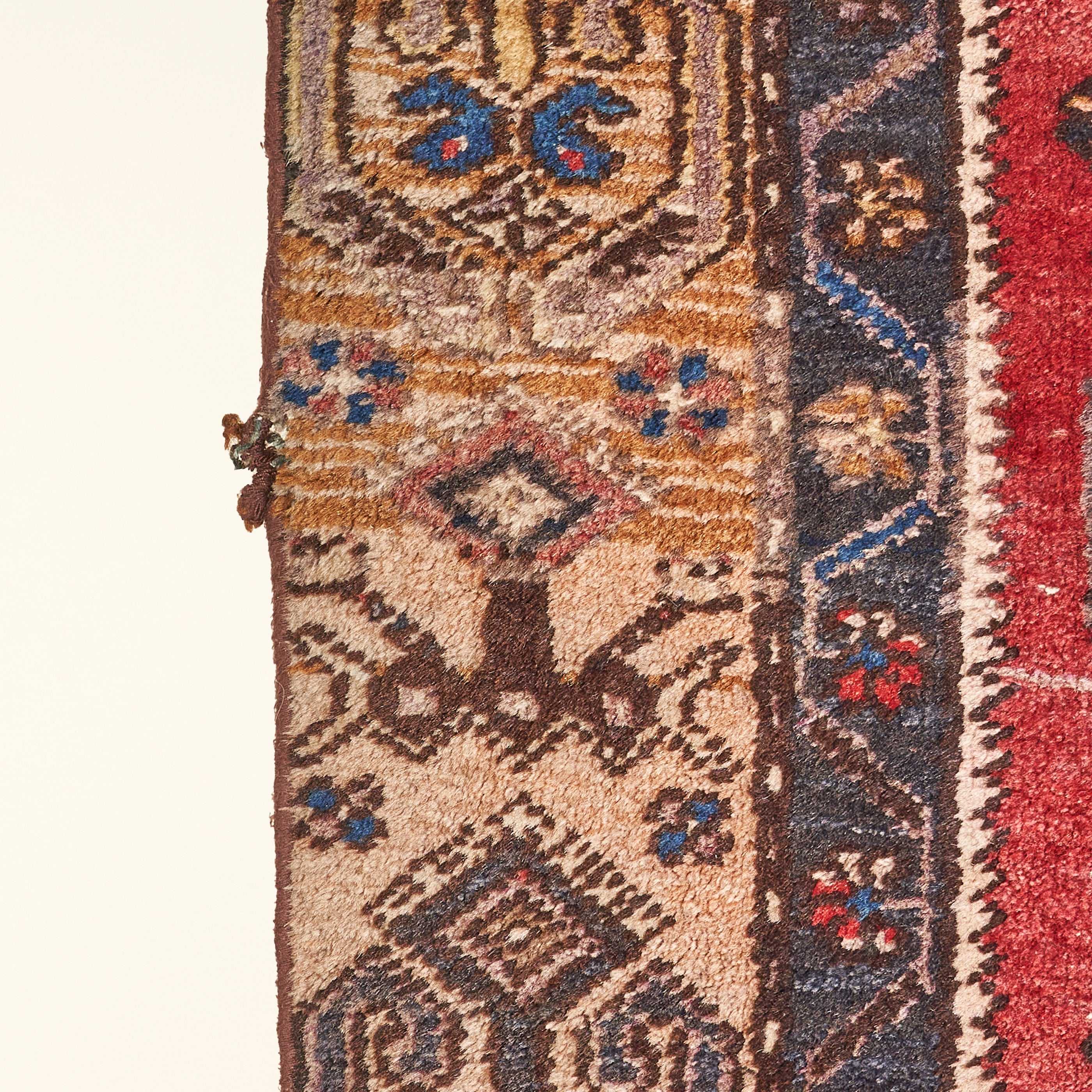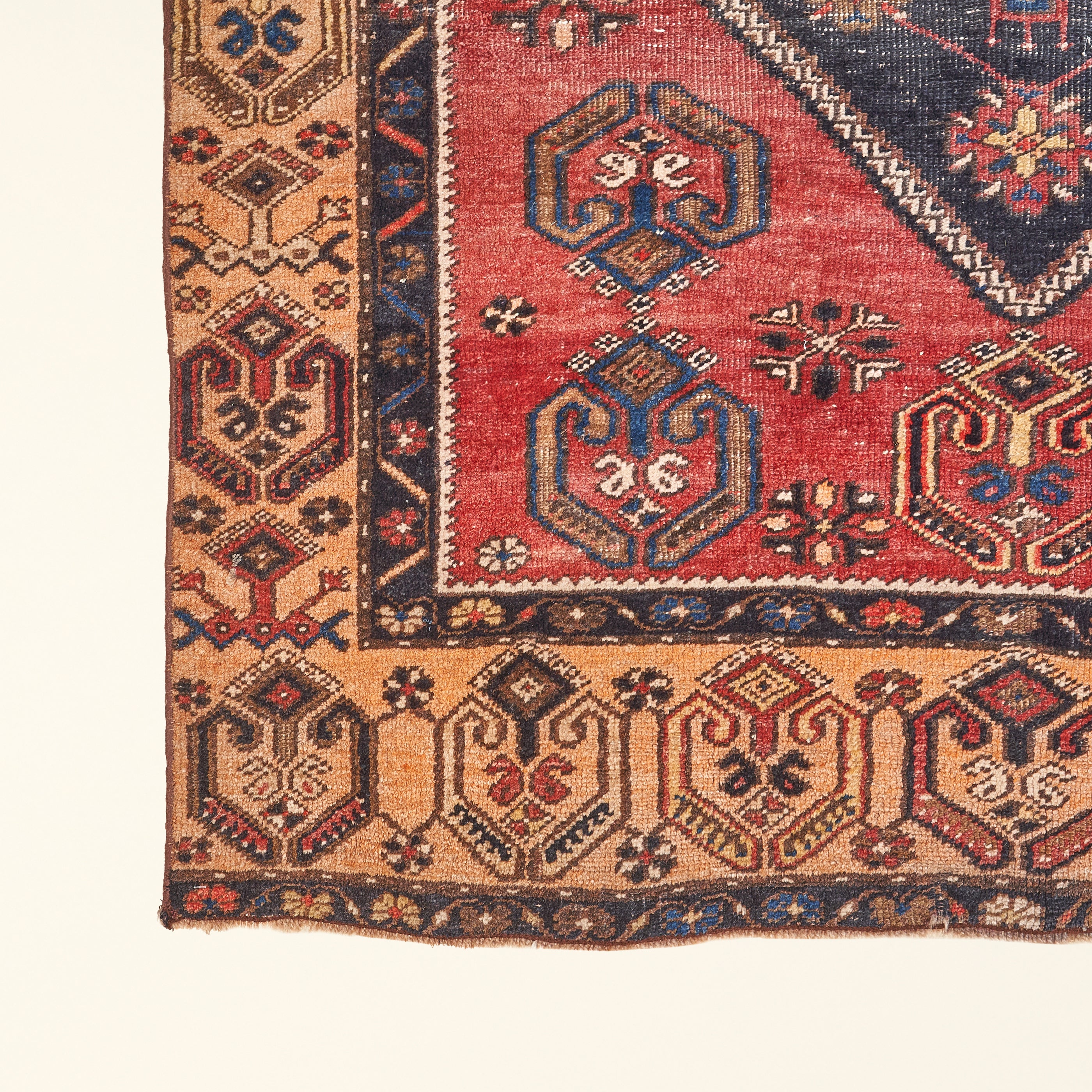 Vintage hand-knotted rug in bold colors. This rug is sold as-is; please see third and fourth photo for details of wear.