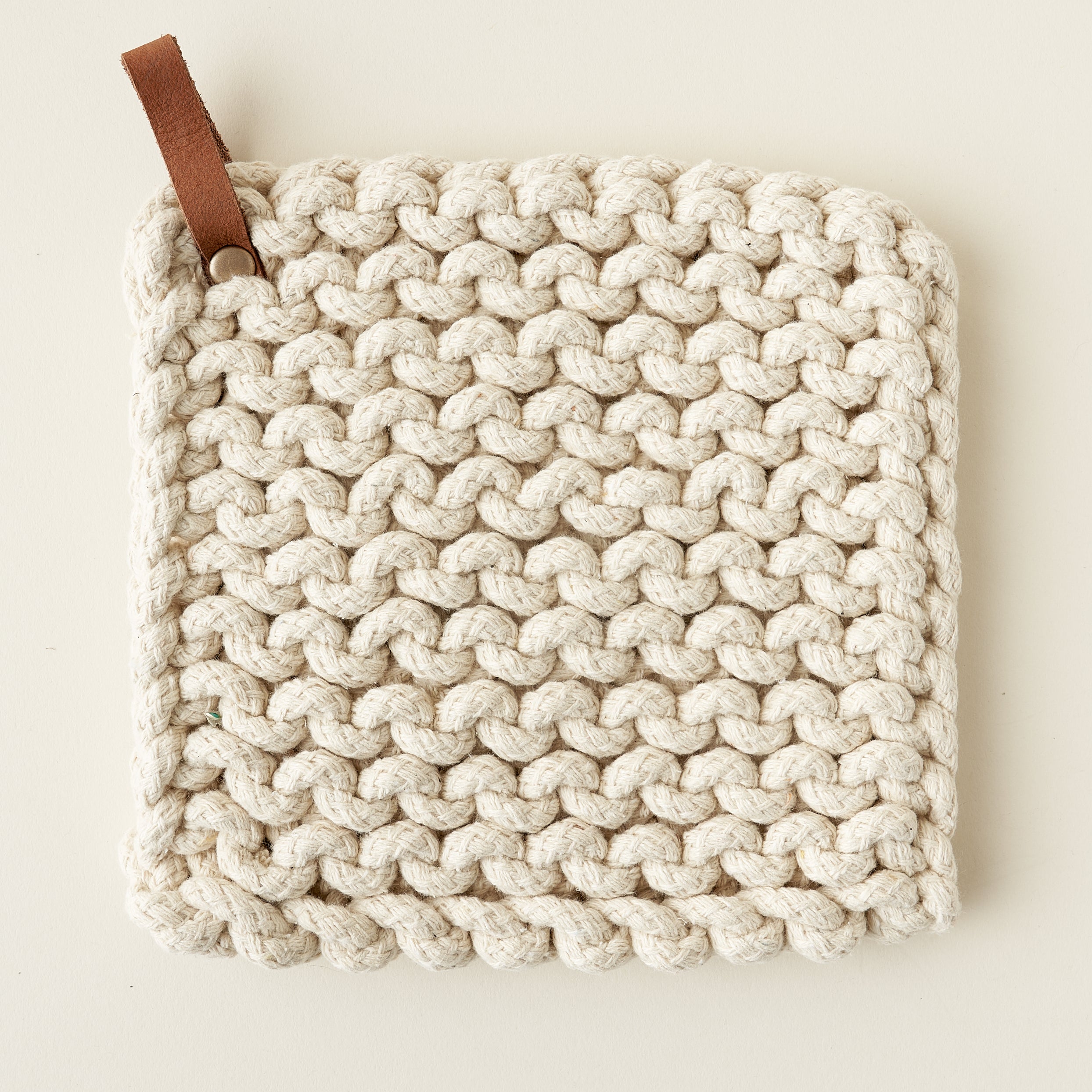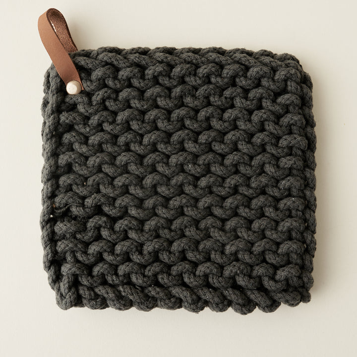 This beautiful Cotton Crocheted Pot Holder is a perfect combination of style and function. The soft crocheted cotton is durable and heat resistant, while a comfortable leather loop makes for easy storage. This is a practical and stylish addition to any kitchen.