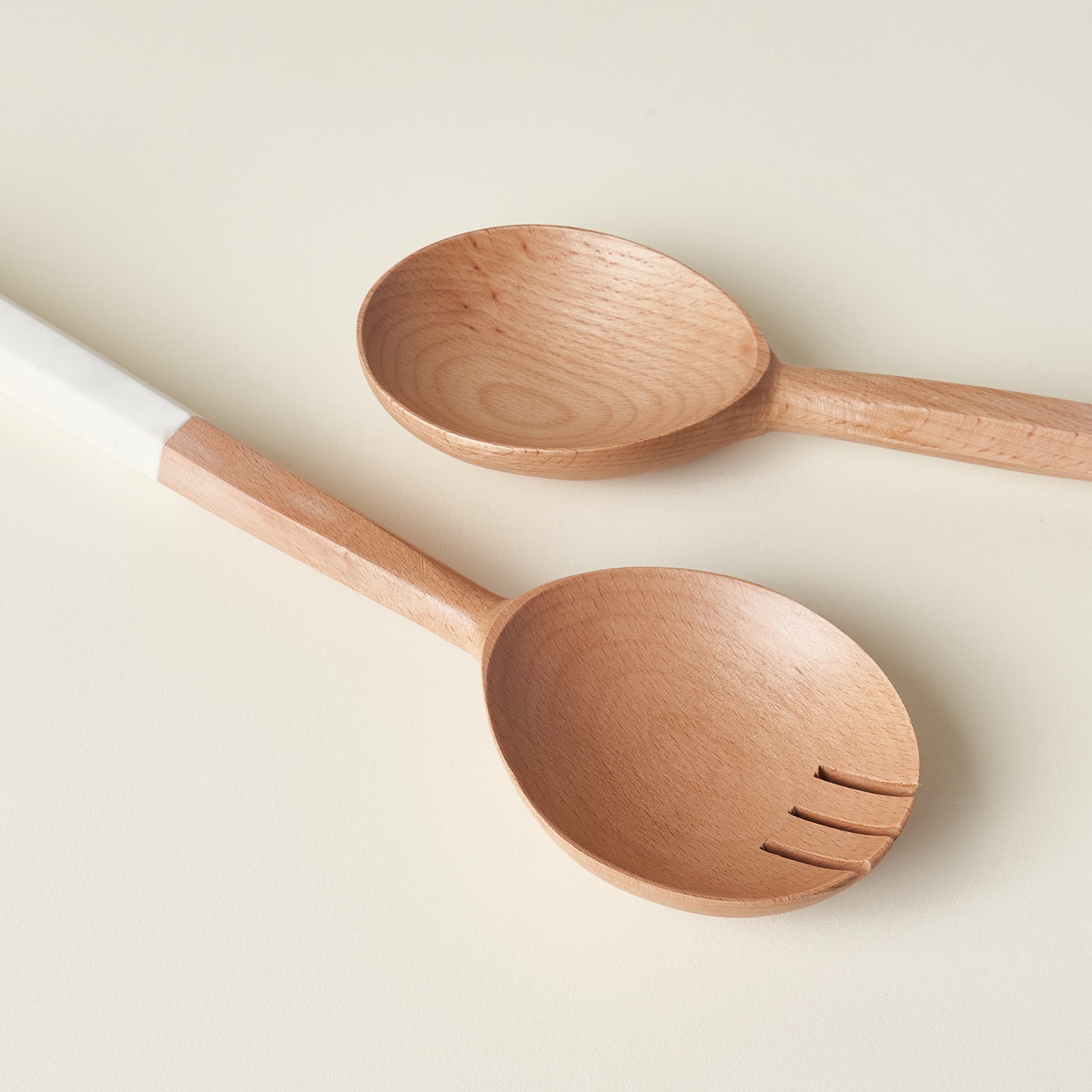 Serve your salads in style with our Crete Salad Servers, a timeless serving set that effortlessly blends natural and modern elements. This elegant duo features medium-toned wood handles fastened onto unique hexagon-shaped white marble heads. This set is a beautiful and sophisticated addition to any tablescape, perfect for both everyday dining and special occasions.
