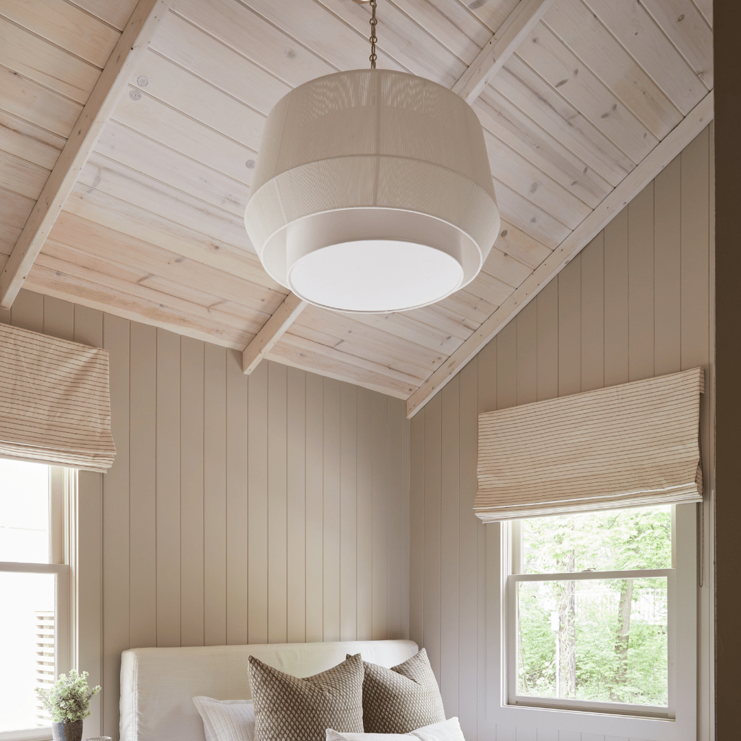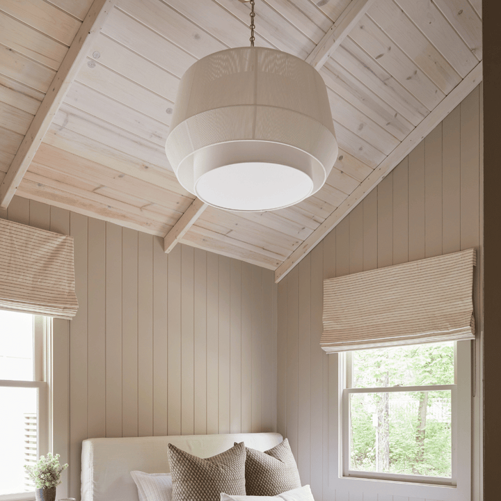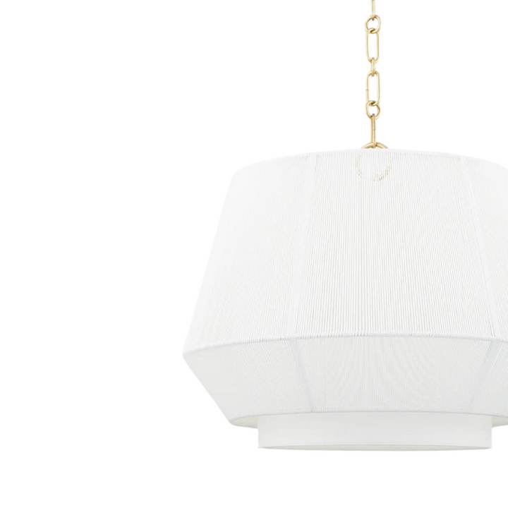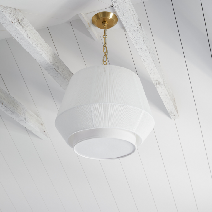 The Debi Pendant is a dynamic design, playing with layers, texture, and tone. The linen drum shade creates a column of light, while the metal frame adds a touch of glamour and wraps delicately in linen strings. Aged brass accents complete the monochromatic look. Illuminate your space with this multi-dimensional silhouette.