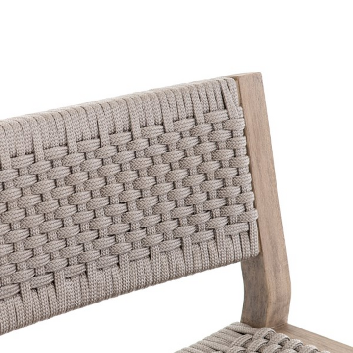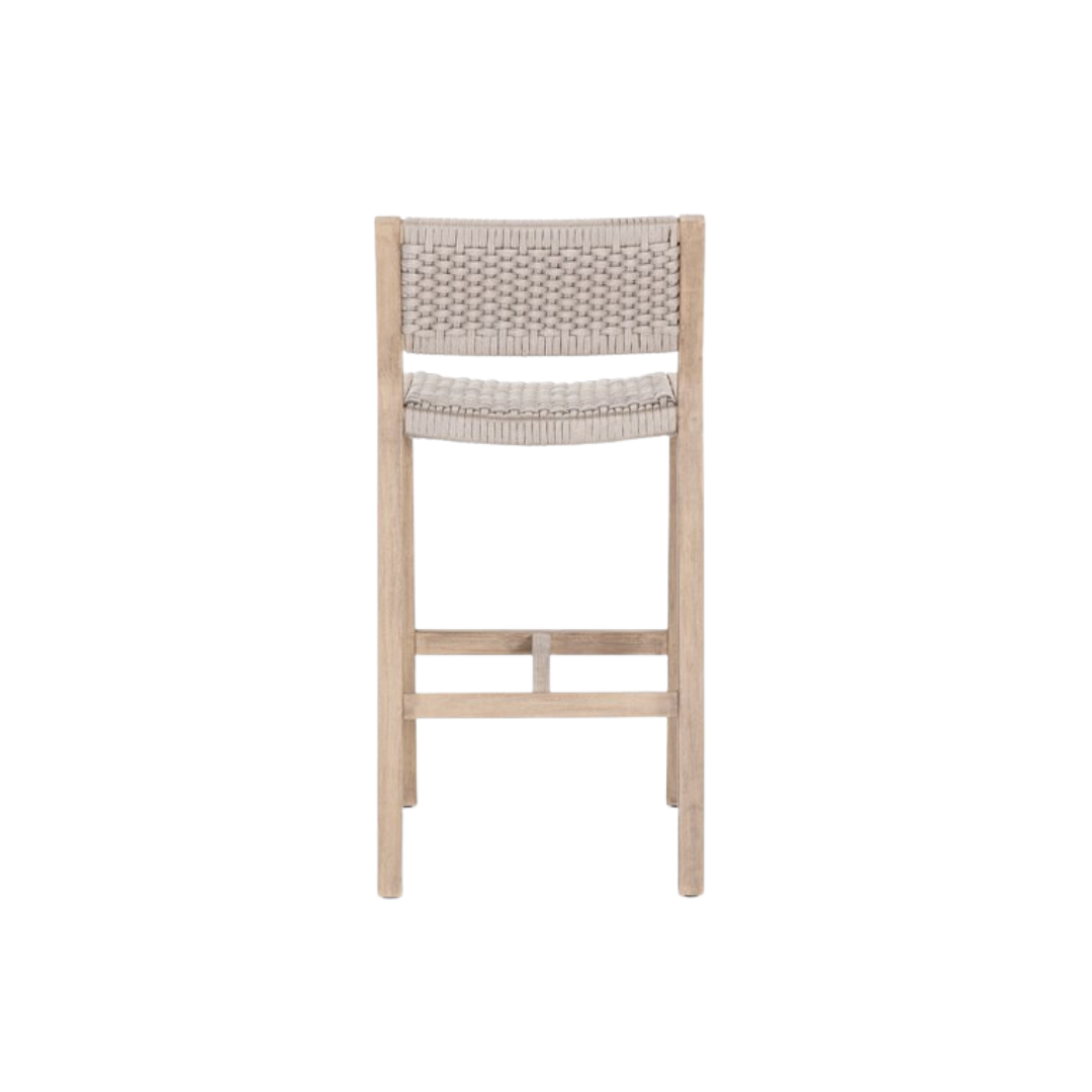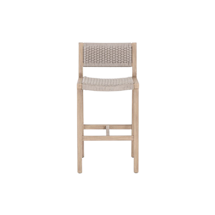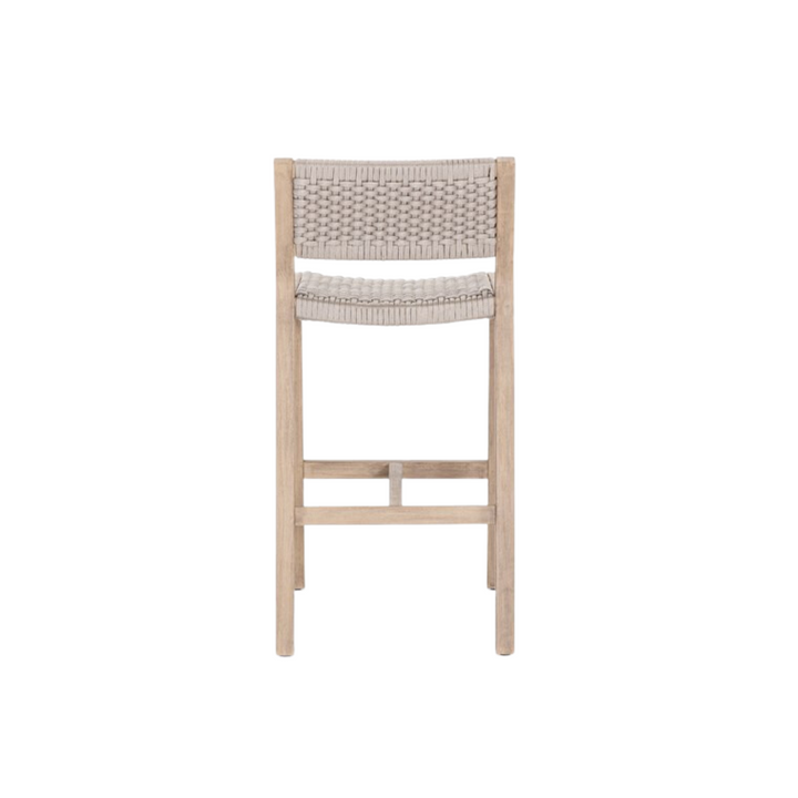 Experience outdoor entertaining with style and comfort. With a washed brown teak frame and light grey, handwoven rope seating, the Delray Outdoor Bar + Counter Stool seamlessly blends texture and resilience for long-term durability. Keep it protected from inclement weather or store indoors when not in use.