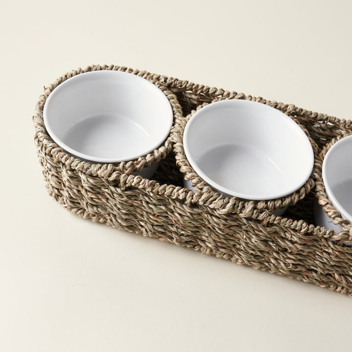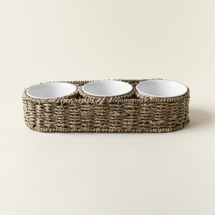 Skillfully crafted and versatile, this hand-woven seagrass Divided Server includes three 6 oz. ceramic bowls. Perfect for any gathering, its unique design allows for the easy organization and presentation of various dips, condiments, or candy.