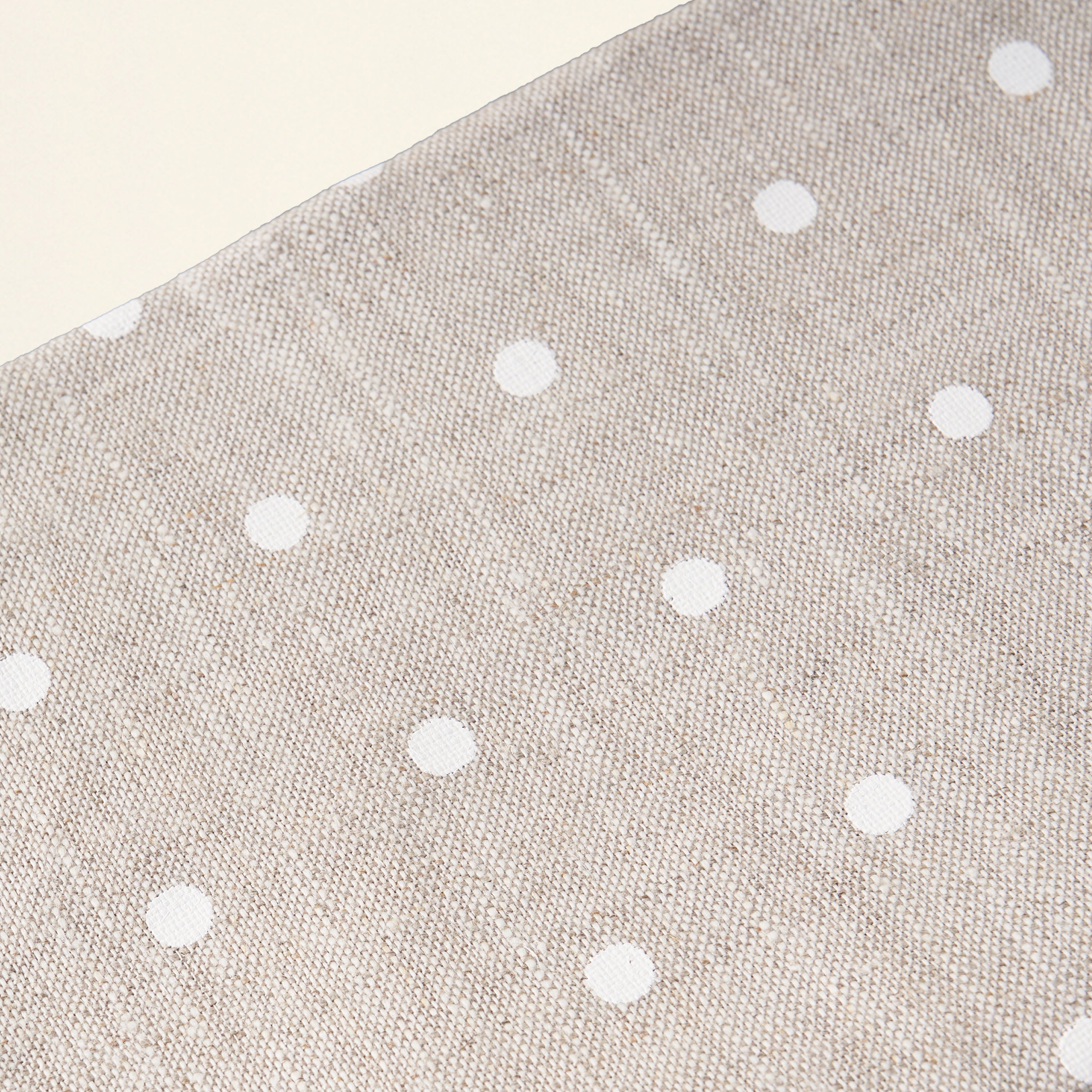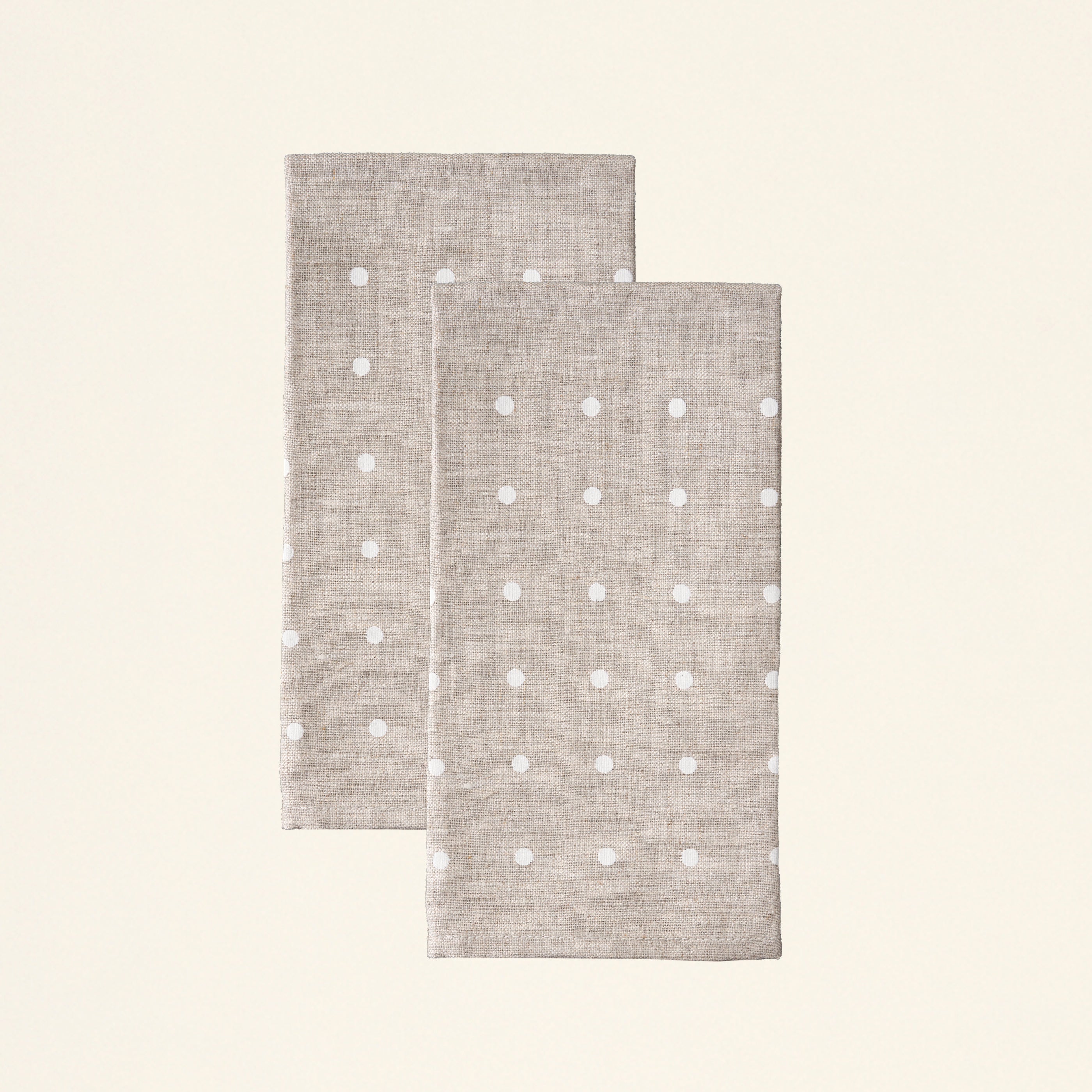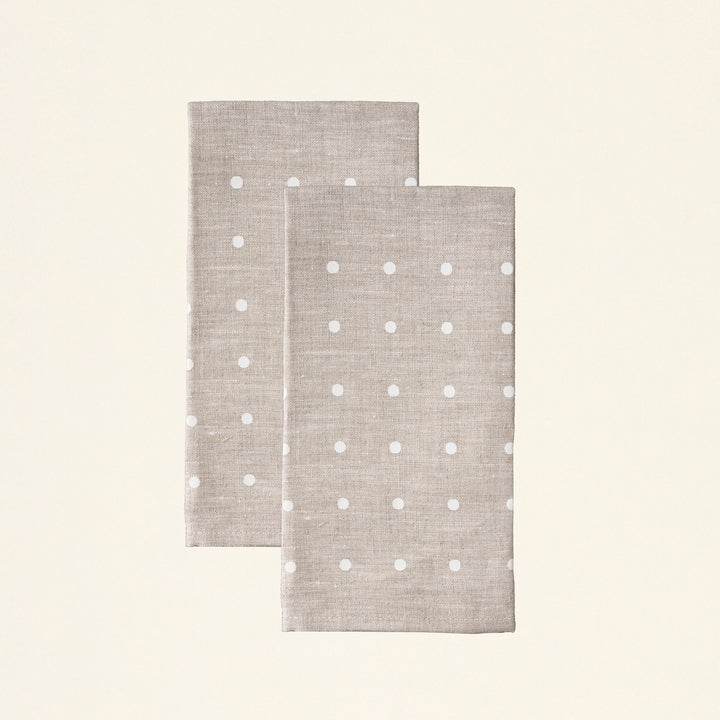 Set of two napkins in grey with white polka dots. Crafted from 100% linen, carefully hand-screen printed, and finished with a narrow double fold hem. Offering relaxed beauty and super quality, these linen napkins have a look of timeless and understated elegance. Regular use and laundering will only make the linen softer, supple and enduring.