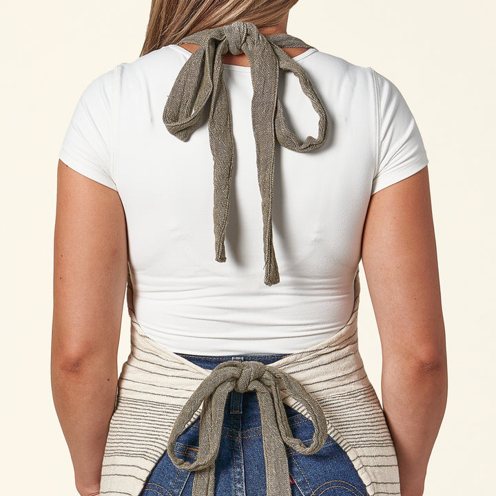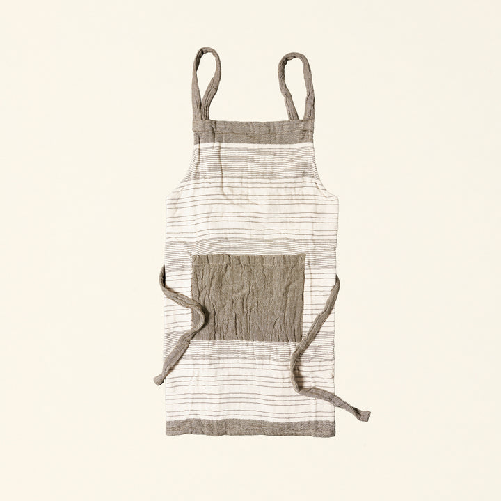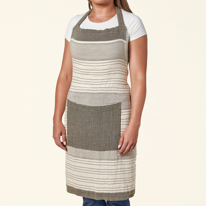 This apron in soft green stripes is made of double cloth cotton and is soft to the touch. Features a large front pocket and ties at the neck and waist.