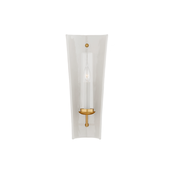 Introduce the classic Downey Reflector Sconce to your interior space for a traditional touch. Its curved reactive ceramic body creates a warm and reflective glow, enhancing the ambiance of any room. With its glass tube, experience a soft and inviting atmosphere.