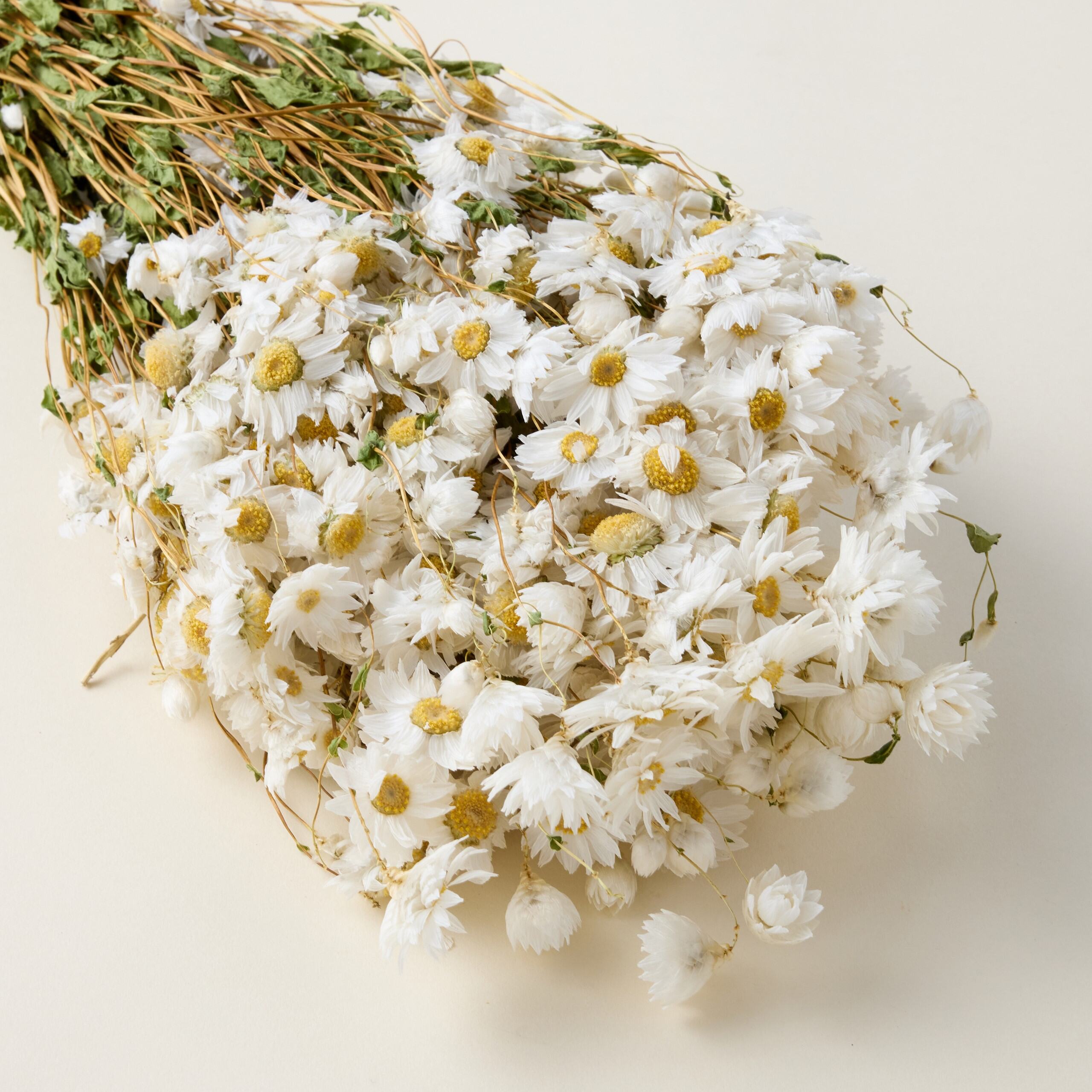 Enhance your floral arrangements with this all-natural Dried White Rhodanthe Daisy. Its delicate and papery texture brings a unique touch to any vessel, providing a versatile and long-lasting option to any floral design.