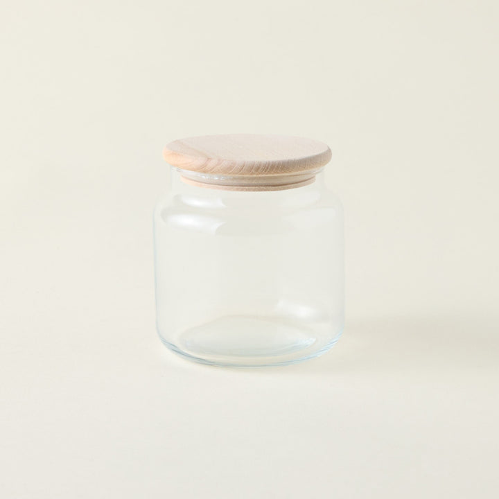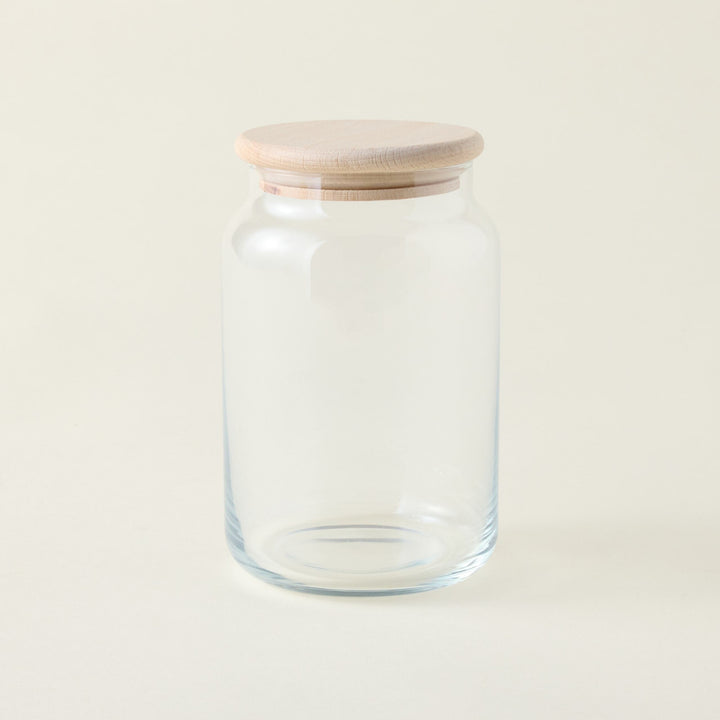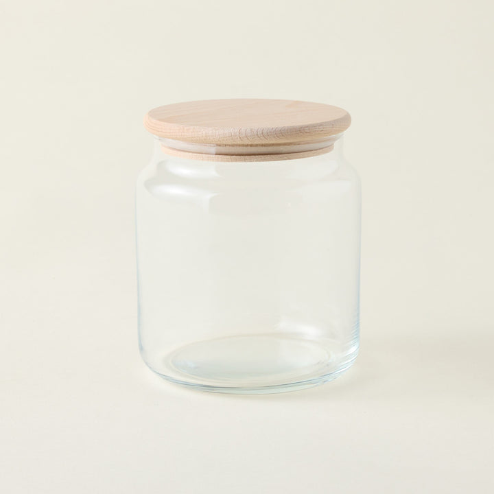 An essential and beautiful storage solution, this Dry Goods Canister is a piece of functional art for your kitchen. The sleek glass base offers clear visibility, while a natural wooden lid with a silicone gasket provides a secure closure. This thoughtfully made canister combines the clarity of glass with the warm, organic texture of wood, making it perfect for organizing and displaying everything from grains to spices. Mix and match these curated canisters for a stylish, timeless look.
