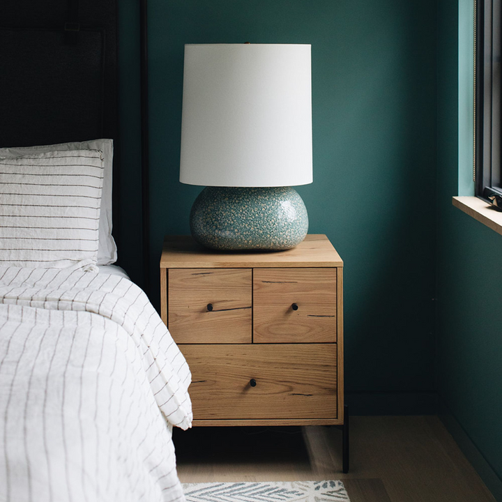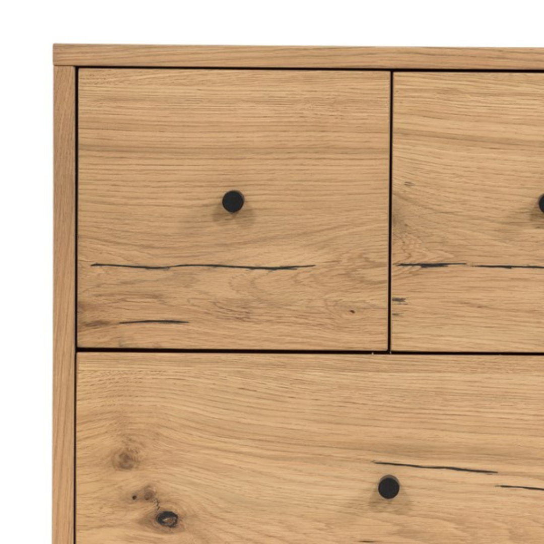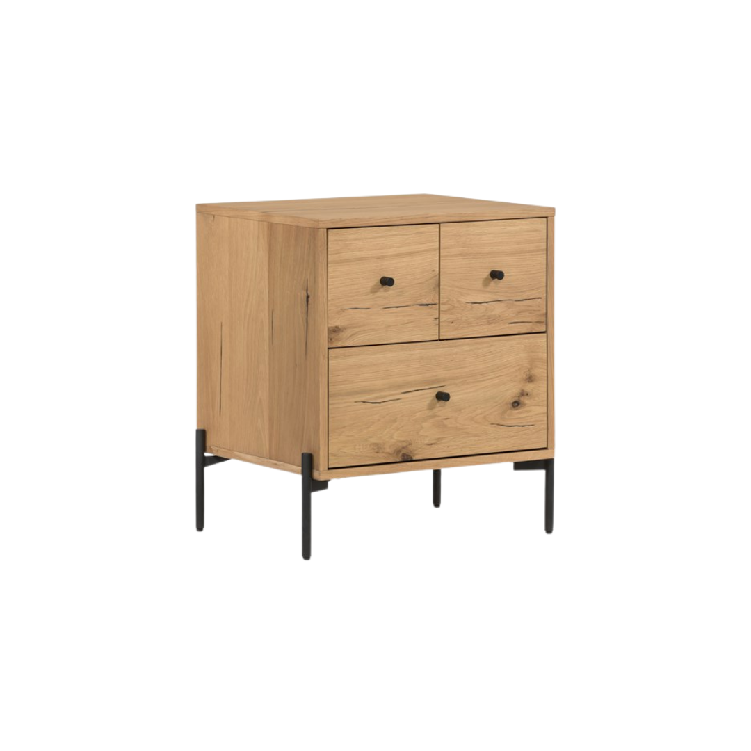 Clean and streamlined. Light-finished oak features three drawers plus gunmetal-finished hardware, for a crisp look that's always in style. Dark resin plays up natural graining for texture and authenticity.