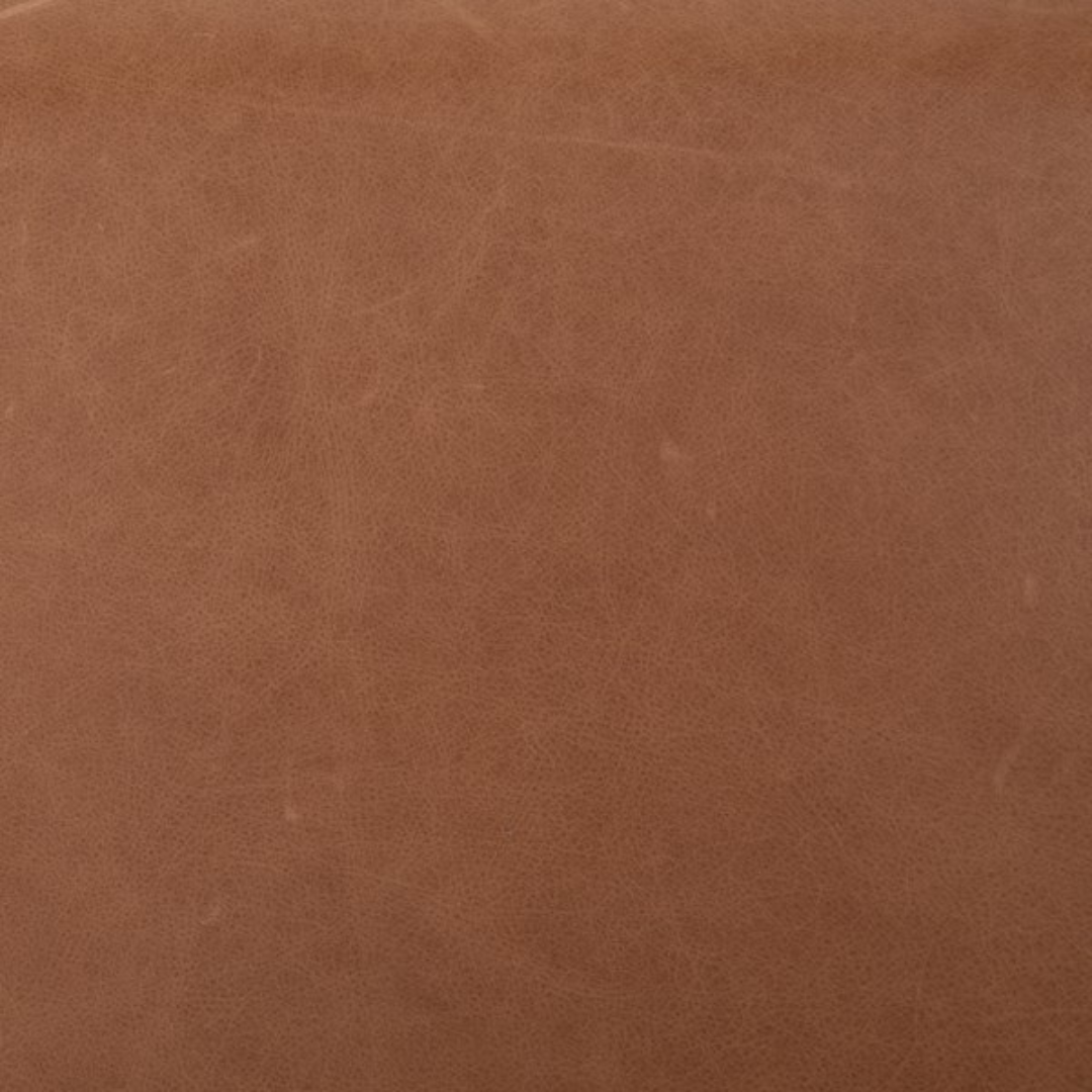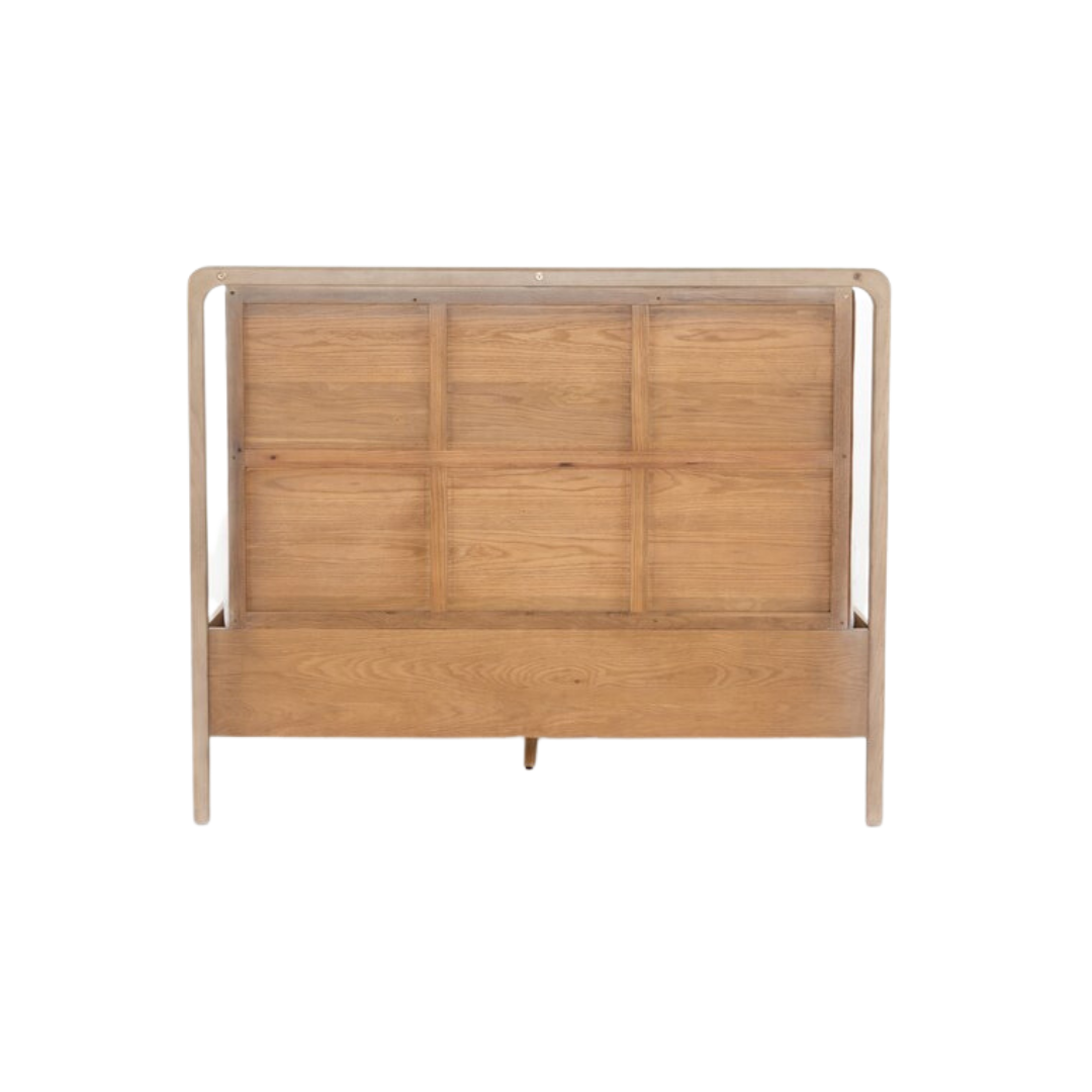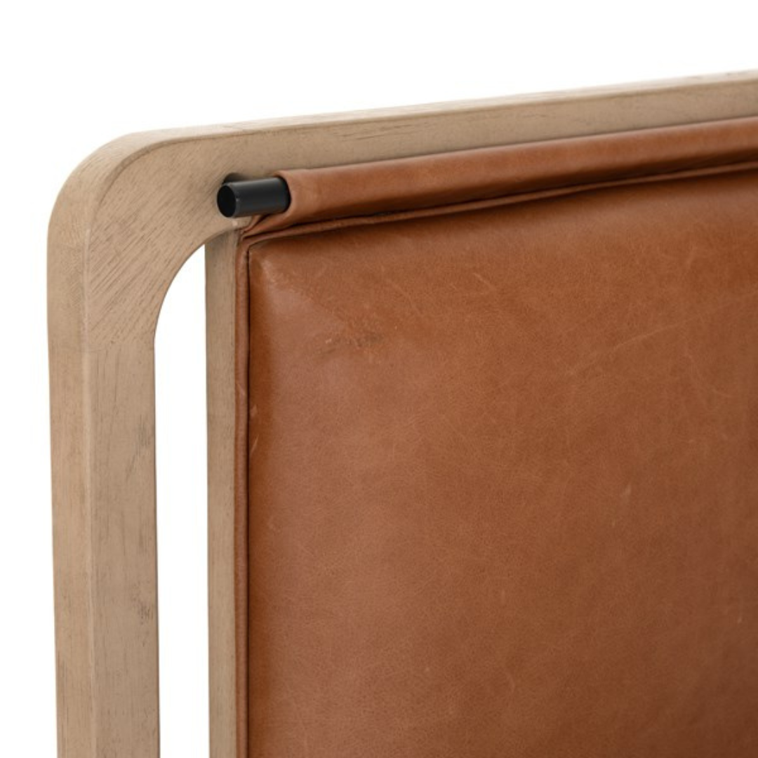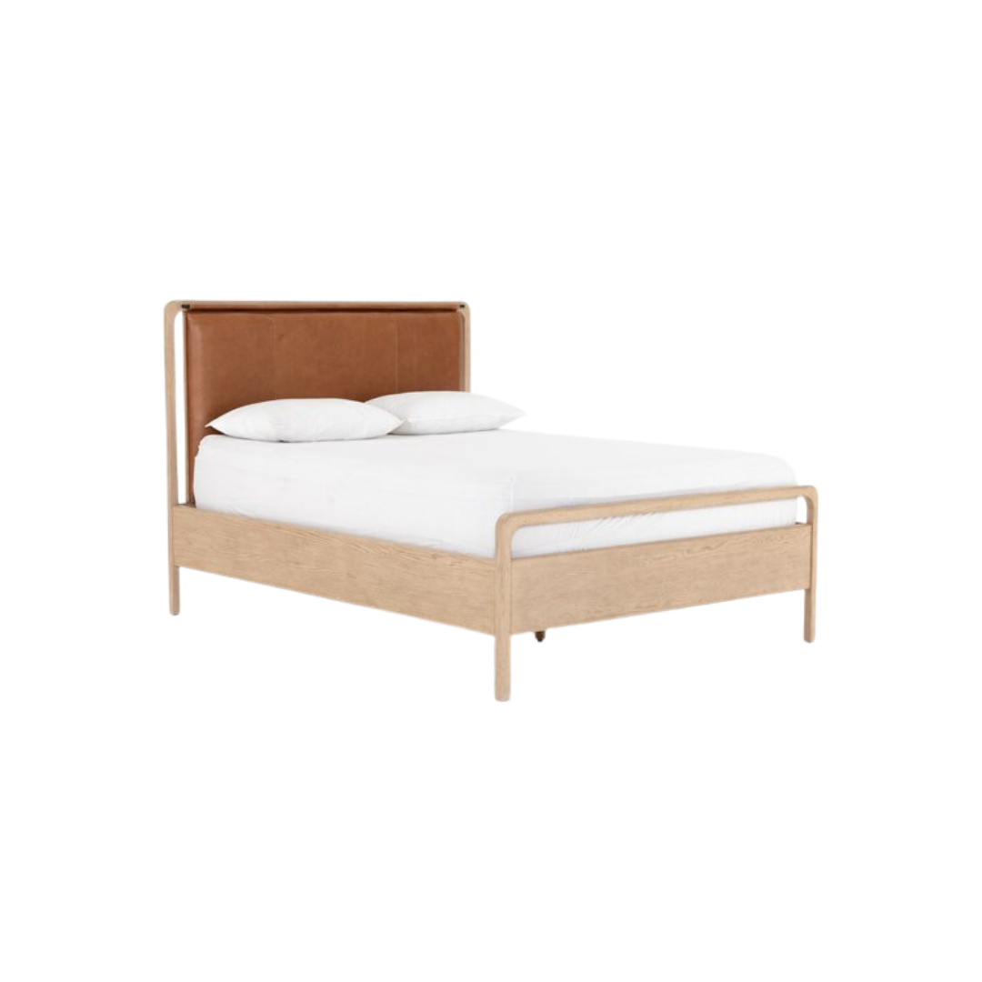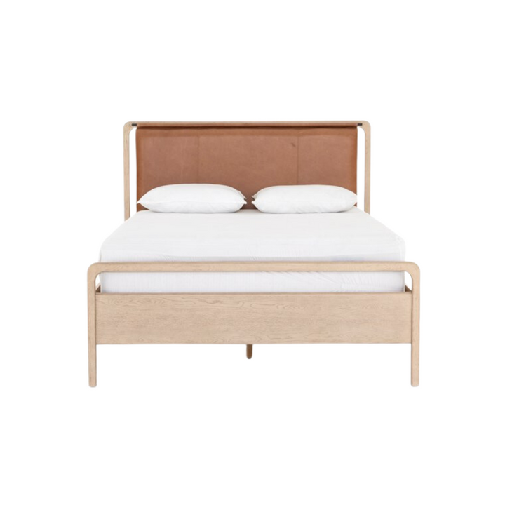 Light, clean and totally unique. Washed oak frames a sling-style headboards of tan top-grain leather, for a modern material mix and soft look. This bed is not compatible with an adjustable mattress.