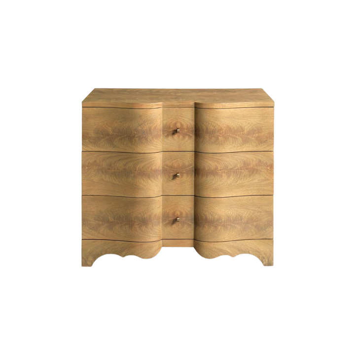 A true statement piece, the Evelyn Chest adds a touch of classic sophistication to any space. Crafted from hardwood solids and cerejeira veneer, this chest is a beautiful addition to a bedroom as a bedside table or styled in a living room. It features a unique shaped front with three individual drawers over a charming scalloped base, combining both beauty and function.