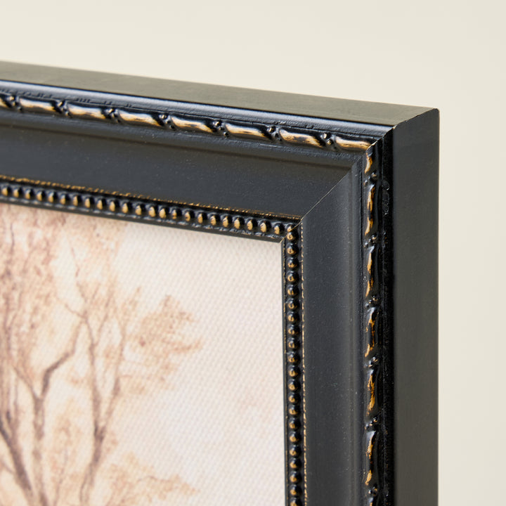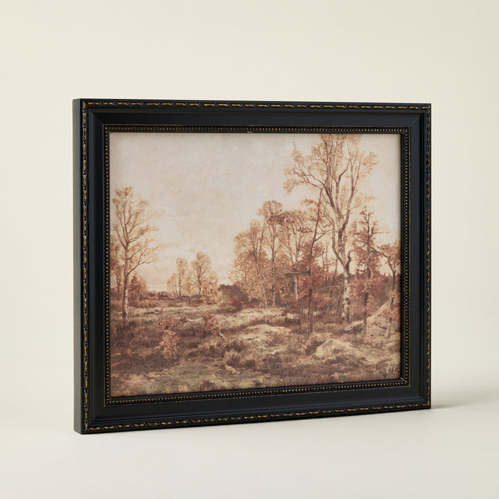 Bring warmth into any kitchen, living room, bedroom, or shelf display with this Fall Landscape featuring a French Country black mould frame. Its classic design complements various decor styles and perfectly suited for pairing with our art easels. This artwork offers a refined touch to enhance your space with seasonal charm and timeless elegance.