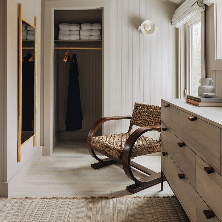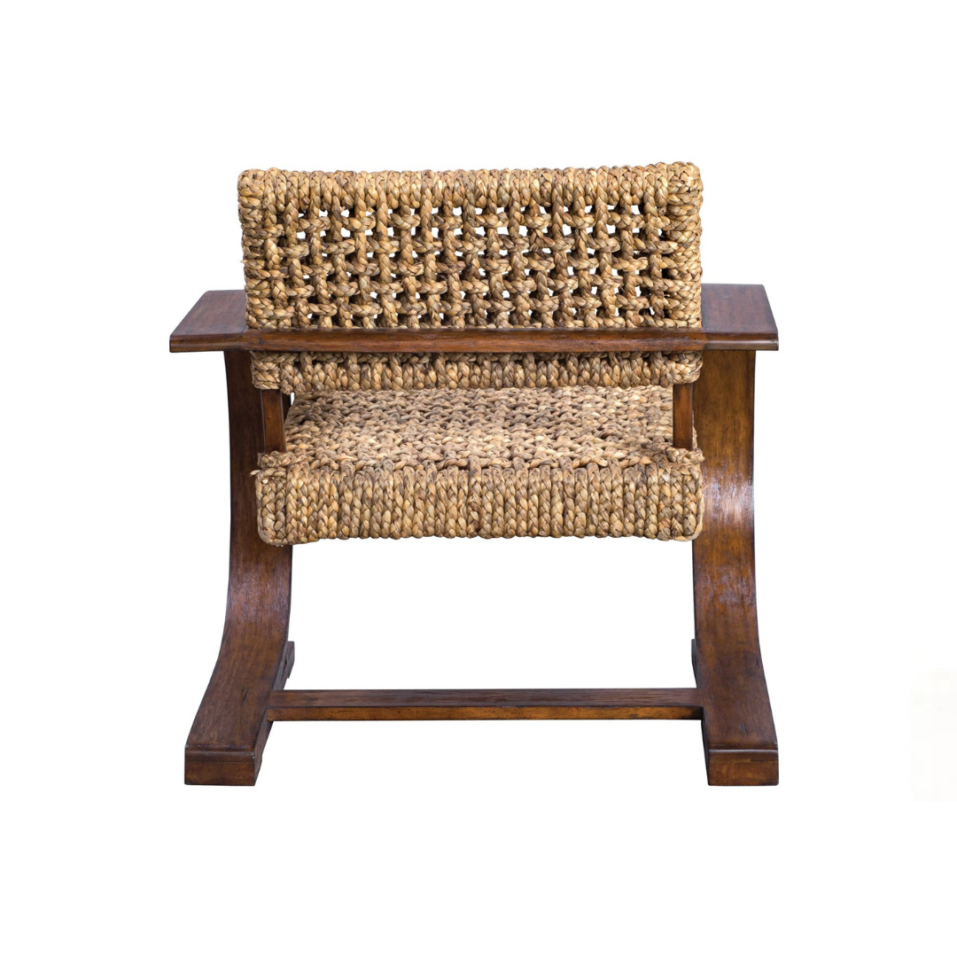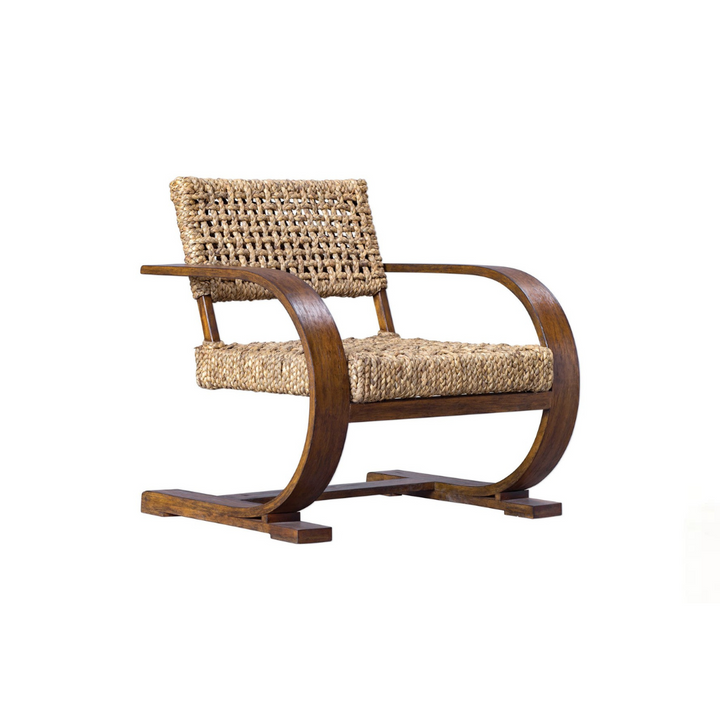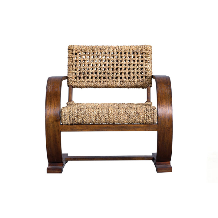 Crafted with a sturdy curved solid wood frame and a natural woven water hyacinth seat, the Faye Accent Chair offers both style and flexibility. This chair also features a beautiful teak veneer layered with a weathered pecan stain and brings relaxed living to any space.