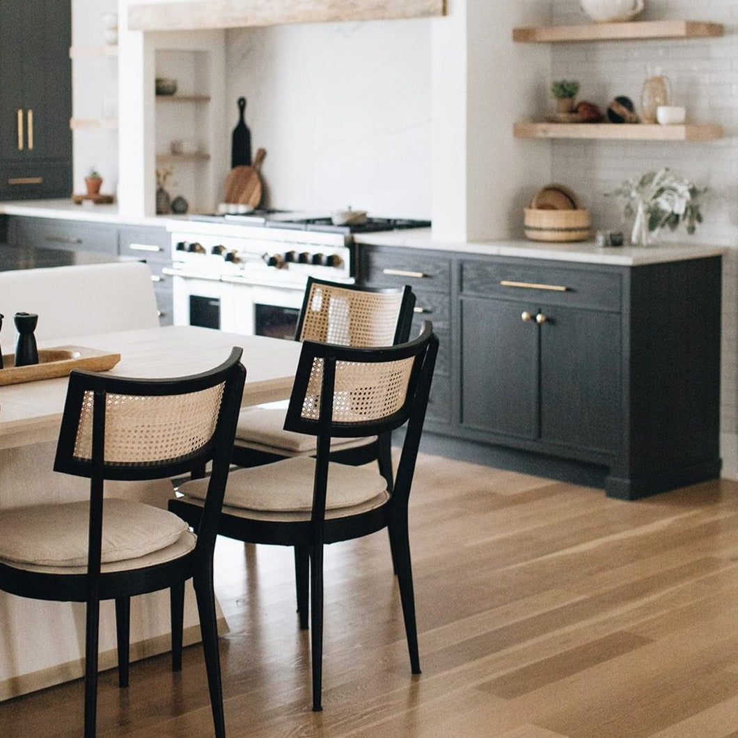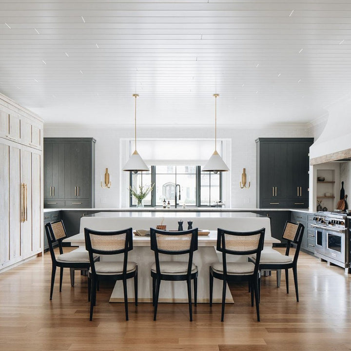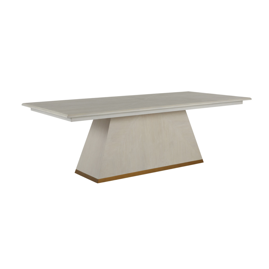The sleekly angled base of this Dining Table gives a contemporary attitude to the traditional rectangular-shaped table. Gold-toned banding gives the solid mahogany base a refined finish. The white cerused colorway makes it easy to creatively pair chairs in a variety of styles and finishes.