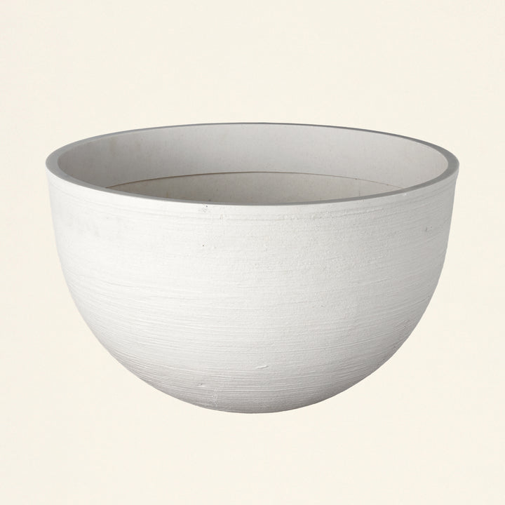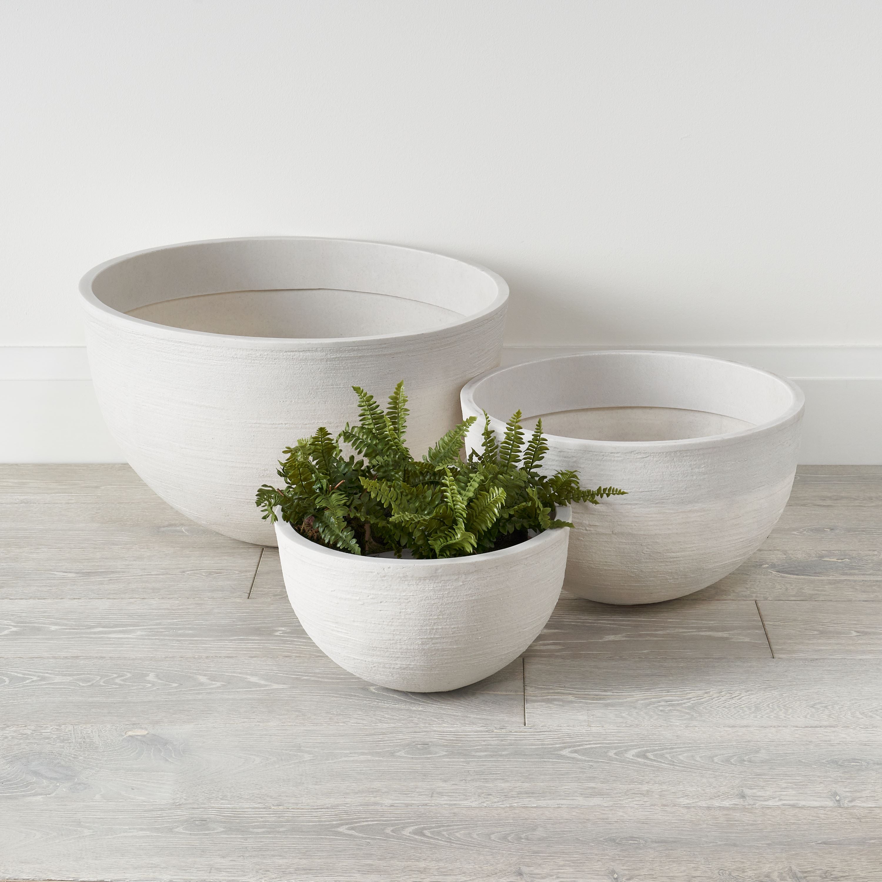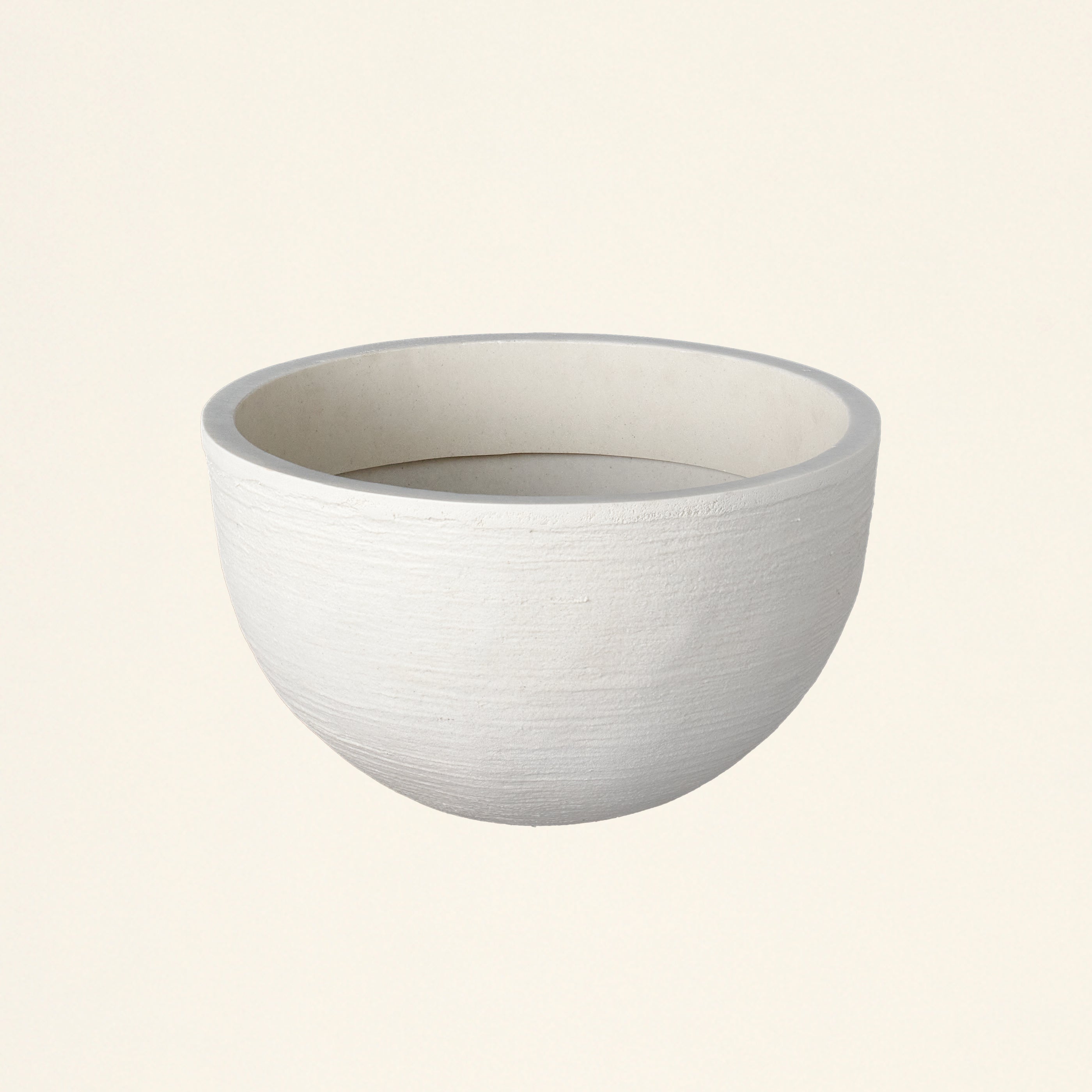 Made from a composite of ground stone and other natural materials, Fiberstone is lightweight. These planters offer clean, contemporary shapes with a textured finish in pure white. Retained salts, fertilizers, and rain will be absorbed for a natural and attractive aging process. Protect from hard freeze. Ensure drainage to avoid cracks. Choose between 3 sizes.